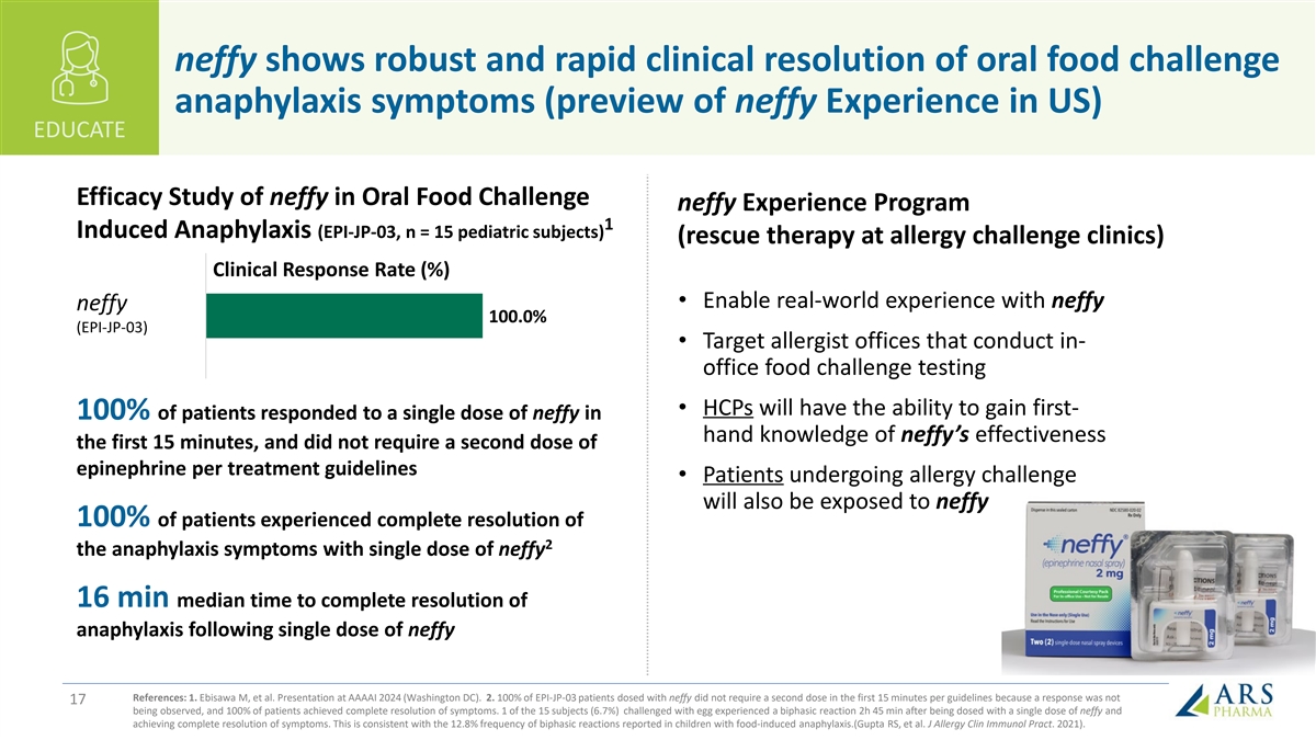 Drive adoption within specialty and high decile prescribers EDUCATE Healthcare Provider Launch Objectives • Commercial force of 110 Sales and Virtual Representatives and Area Sales Managers • Calling on 12,500 Allergy Specialists and High Decile Prescribers • Reaching 40-45% of Prescriptions from all HCPs • Reaching >80% of Prescriptions from Allergists and Pediatricians • Education, awareness, and resources to drive adoption (neffy Experience) 16