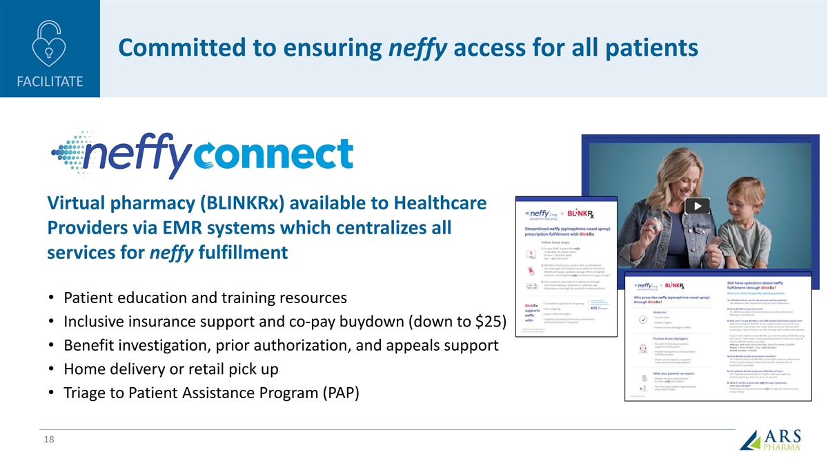 neffy shows robust and rapid clinical resolution of oral food challenge anaphylaxis symptoms (preview of neffy Experience in US) EDUCATE Efficacy Study of neffy in Oral Food Challenge neffy Experience Program 1 Induced Anaphylaxis (EPI-JP-03, n = 15 pediatric subjects) (rescue therapy at allergy challenge clinics) Clinical Response Rate (%) • Enable real-world experience with neffy neffy 100.0% (EPI-JP-03) • Target allergist offices that conduct in- office food challenge testing • HCPs will have the ability to gain first- 100% of patients responded to a single dose of neffy in hand knowledge of neffy’s effectiveness the first 15 minutes, and did not require a second dose of epinephrine per treatment guidelines • Patients undergoing allergy challenge will also be exposed to neffy 100% of patients experienced complete resolution of 2 the anaphylaxis symptoms with single dose of neffy 16 min median time to complete resolution of anaphylaxis following single dose of neffy References: 1. Ebisawa M, et al. Presentation at AAAAI 2024 (Washington DC). 2. 100% of EPI-JP-03 patients dosed with neffy did not require a second dose in the first 15 minutes per guidelines because a response was not 17 being observed, and 100% of patients achieved complete resolution of symptoms. 1 of the 15 subjects (6.7%) challenged with egg experienced a biphasic reaction 2h 45 min after being dosed with a single dose of neffy and achieving complete resolution of symptoms. This is consistent with the 12.8% frequency of biphasic reactions reported in children with food-induced anaphylaxis.(Gupta RS, et al. J Allergy Clin Immunol Pract. 2021).