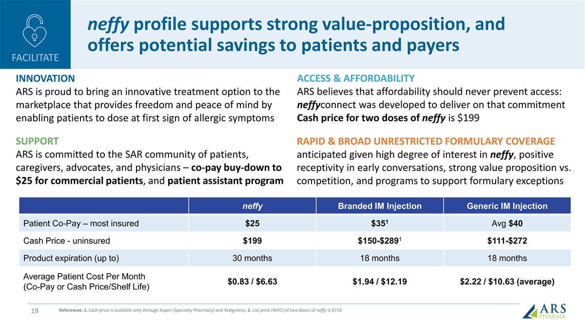 Committed to ensuring neffy access for all patients FACILITATE Virtual pharmacy (BLINKRx) available to Healthcare Providers via EMR systems which centralizes all services for neffy fulfillment • Patient education and training resources • Inclusive insurance support and co-pay buydown (down to $25) • Benefit investigation, prior authorization, and appeals support • Home delivery or retail pick up • Triage to Patient Assistance Program (PAP) 18