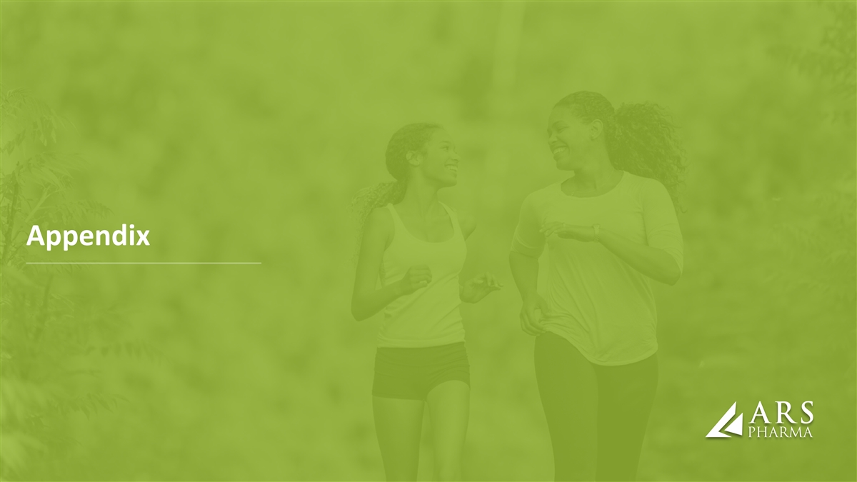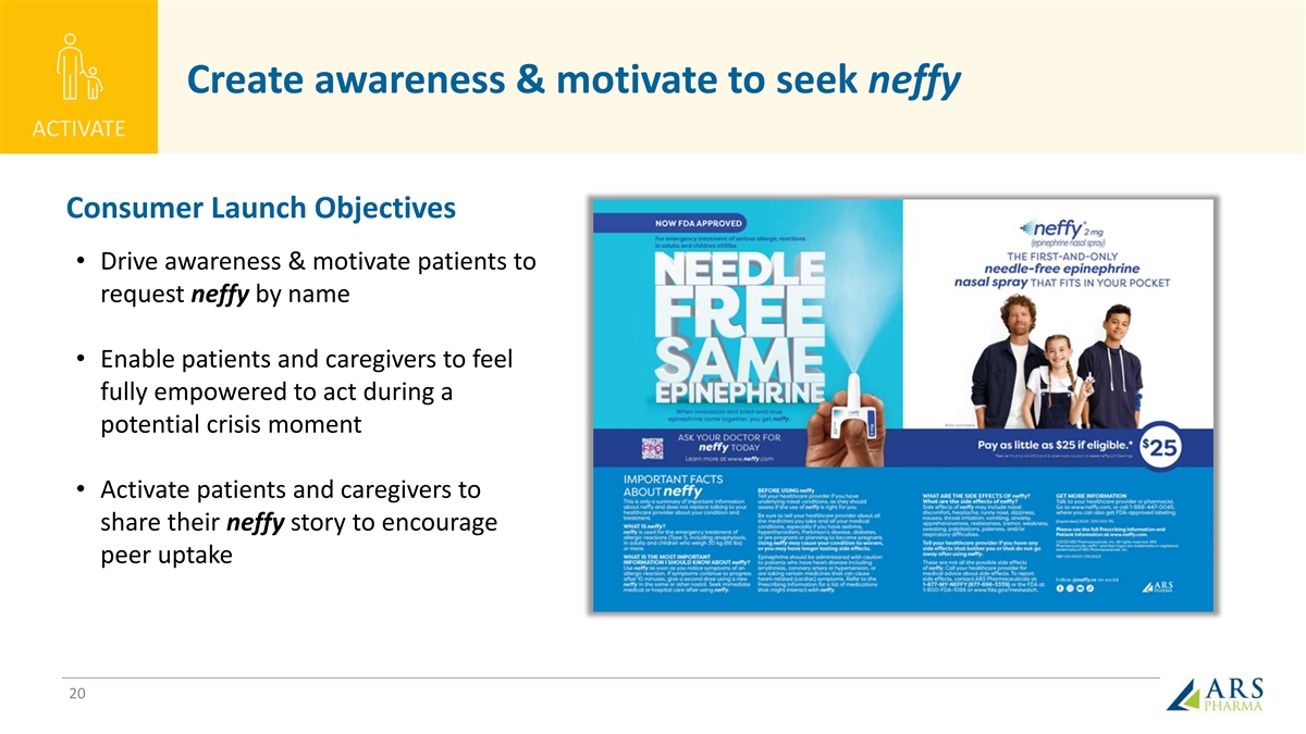 neffy profile supports strong value-proposition, and offers potential savings to patients and payers FACILITATE INNOVATION ACCESS & AFFORDABILITY ARS is proud to bring an innovative treatment option to the ARS believes that affordability should never prevent access: marketplace that provides freedom and peace of mind by neffyconnect was developed to deliver on that commitment enabling patients to dose at first sign of allergic symptoms Cash price for two doses of neffy is $199 SUPPORT RAPID & BROAD UNRESTRICTED FORMULARY COVERAGE ARS is committed to the SAR community of patients, anticipated given high degree of interest in neffy, positive caregivers, advocates, and physicians – co-pay buy-down to receptivity in early conversations, strong value proposition vs. $25 for commercial patients, and patient assistant program competition, and programs to support formulary exceptions neffy Branded IM Injection Generic IM Injection 1 Patient Co-Pay – most insured $25 $35 Avg $40 1 Cash Price - uninsured $199 $150-$289 $111-$272 Product expiration (up to) 30 months 18 months 18 months Average Patient Cost Per Month $0.83 / $6.63 $1.94 / $12.19 $2.22 / $10.63 (average) (Co-Pay or Cash Price/Shelf Life) References: 1. Cash price is available only through Aspen (Specialty Pharmacy) and Walgreens, 2. List price (WAC) of two doses of neffy is $710 19