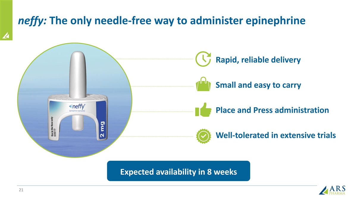 neffy: The only needle-free way to administer epinephrine Rapid, reliable delivery Small and easy to carry Place and Press administration Well-tolerated in extensive trials Expected availability in 8 weeks 21