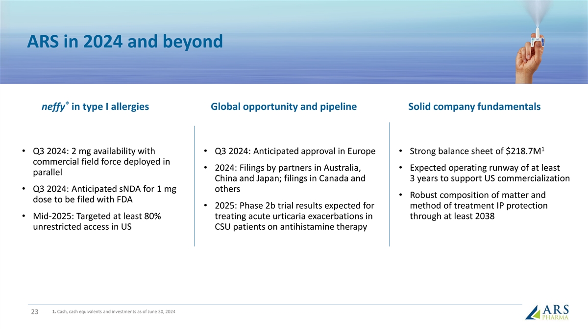 ARS in 2024 and beyond ® neffy in type I allergies Global opportunity and pipeline Solid company fundamentals 1 • Q3 2024: 2 mg availability with • Q3 2024: Anticipated approval in Europe • Strong balance sheet of $218.7M commercial field force deployed in • 2024: Filings by partners in Australia, • Expected operating runway of at least parallel China and Japan; filings in Canada and 3 years to support US commercialization • Q3 2024: Anticipated sNDA for 1 mg others • Robust composition of matter and dose to be filed with FDA • 2025: Phase 2b trial results expected for method of treatment IP protection • Mid-2025: Targeted at least 80% treating acute urticaria exacerbations in through at least 2038 unrestricted access in US CSU patients on antihistamine therapy 1. Cash, cash equivalents and investments as of June 30, 2024 23