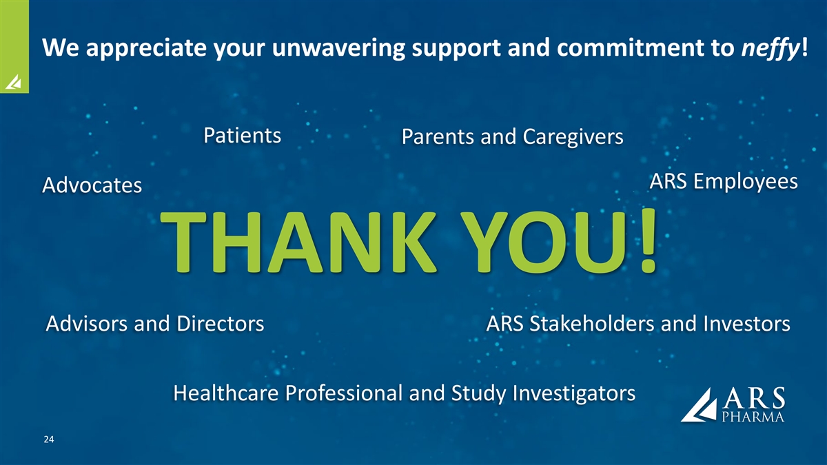 We appreciate your unwavering support and commitment to neffy! Patients Parents and Caregivers ARS Employees Advocates THANK YOU! Advisors and Directors ARS Stakeholders and Investors Healthcare Professional and Study Investigators 24