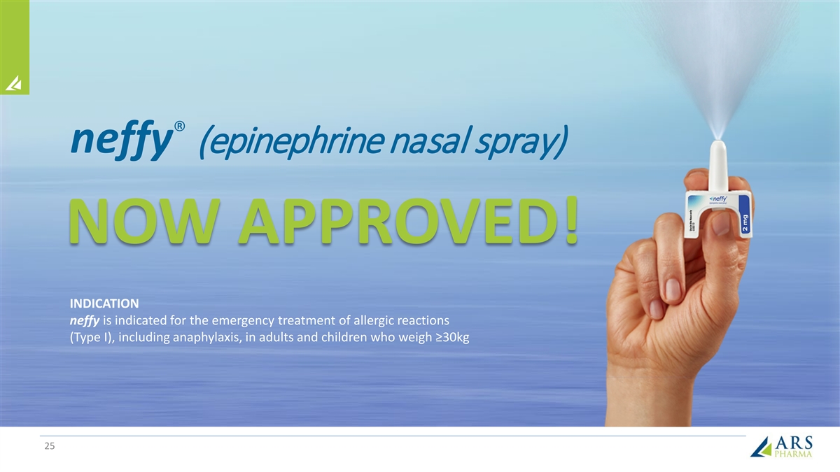 ® neffy (epinephrine nasal spray) NOW APPROVED! INDICATION neffy is indicated for the emergency treatment of allergic reactions (Type I), including anaphylaxis, in adults and children who weigh ≥30kg 25