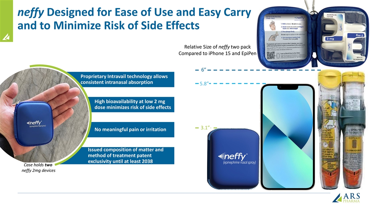neffy Designed for Ease of Use and Easy Carry and to Minimize Risk of Side Effects Relative Size of neffy two pack Compared to iPhone 15 and EpiPen 6” Proprietary Intravail technology allows consistent intranasal absorption 5.8” High bioavailability at low 2 mg dose minimizes risk of side effects 3.1” No meaningful pain or irritation Issued composition of matter and method of treatment patent exclusivity until at least 2038 Case holds two neffy 2mg devices