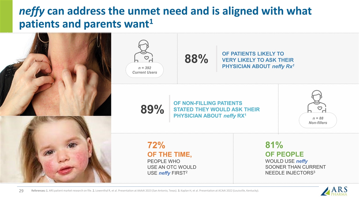 Differentiated FDA label for neffy compared to injection may reduce hesitancy to dose and lead to broader adoption 1 2 Label differentiation Injection neffy 1. Emergency medical assistance “Advise patients when to seek emergency “In conjunction with the administration of after dosing not automatic, medical assistance for close monitoring of epinephrine, the patient should seek immediate consistent with new AAAAI the anaphylactic episode, and in the event medical or hospital care.” treatment guidelines further treatment is required.” • Accidental IV injection may result in cerebral hemorrhage • Accidental injection into digits, hands or feet may result in loss of blood flow to the 2. Removes all injection-related affected area, and immediate visit to No injection-related warnings or warnings and precautions, which may emergency room precautions reduce anxiety and hesitation to dose • Needle-related injury due to lacerations, bent needle and embedded needles • Serious injection site infections including necrotizing fasciitis and myonecrosis 3. Wider temperature stability, which o o o o may facilitate carriage and Excursions permitted from 59 F to 86 F Excursions permitted from 5 F to 122 F continuous readiness 28 References: 1. EpiPen FDA Label – Prescribing Information (2/2023), 2. neffy FDA Label – Prescribing Information (8/2024)