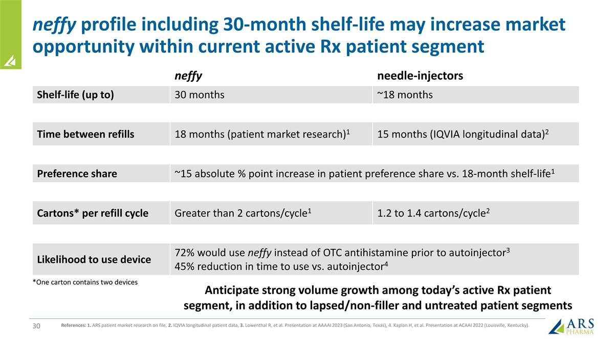 neffy profile including 30-month shelf-life may increase market opportunity within current active Rx patient segment neffy needle-injectors Shelf-life (up to) 30 months ~18 months 1 2 Time between refills 18 months (patient market research) 15 months (IQVIA longitudinal data) 1 Preference share ~15 absolute % point increase in patient preference share vs. 18-month shelf-life 1 2 Cartons* per refill cycle Greater than 2 cartons/cycle 1.2 to 1.4 cartons/cycle 3 72% would use neffy instead of OTC antihistamine prior to autoinjector Likelihood to use device 4 45% reduction in time to use vs. autoinjector *One carton contains two devices Anticipate strong volume growth among today’s active Rx patient segment, in addition to lapsed/non-filler and untreated patient segments References: 1. ARS patient market research on file, 2. IQVIA longitudinal patient data, 3. Lowenthal R, et al. Presentation at AAAAI 2023 (San Antonio, Texas), 4. Kaplan H, et al. Presentation at ACAAI 2022 (Louisville, Kentucky). 30