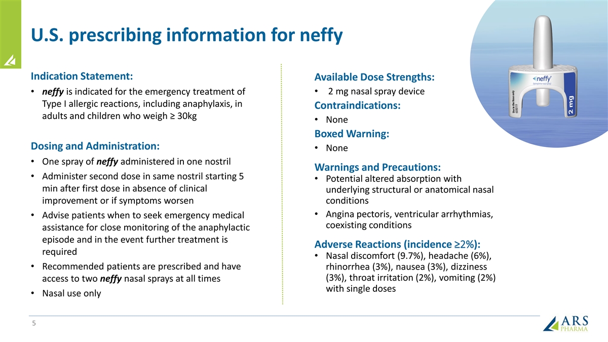 U.S. prescribing information for neffy Indication Statement: Available Dose Strengths: • 2 mg nasal spray device • neffy is indicated for the emergency treatment of Type I allergic reactions, including anaphylaxis, in Contraindications: adults and children who weigh ≥ 30kg • None Boxed Warning: Dosing and Administration: • None • One spray of neffy administered in one nostril Warnings and Precautions: • Administer second dose in same nostril starting 5 • Potential altered absorption with min after first dose in absence of clinical underlying structural or anatomical nasal improvement or if symptoms worsen conditions • Angina pectoris, ventricular arrhythmias, • Advise patients when to seek emergency medical coexisting conditions assistance for close monitoring of the anaphylactic episode and in the event further treatment is Adverse Reactions (incidence ≥2%): required • Nasal discomfort (9.7%), headache (6%), • Recommended patients are prescribed and have rhinorrhea (3%), nausea (3%), dizziness (3%), throat irritation (2%), vomiting (2%) access to two neffy nasal sprays at all times with single doses • Nasal use only 5