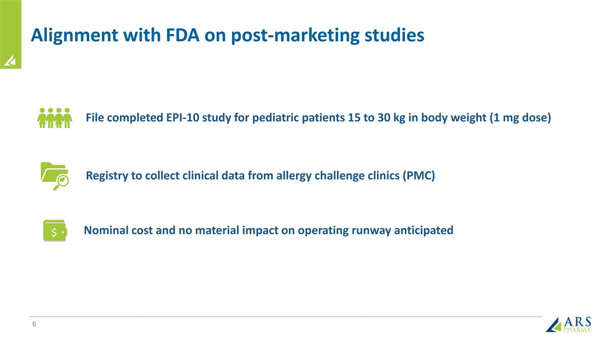 Alignment with FDA on post-marketing studies File completed EPI-10 study for pediatric patients 15 to 30 kg in body weight (1 mg dose) Registry to collect clinical data from allergy challenge clinics (PMC) Nominal cost and no material impact on operating runway anticipated $ 6