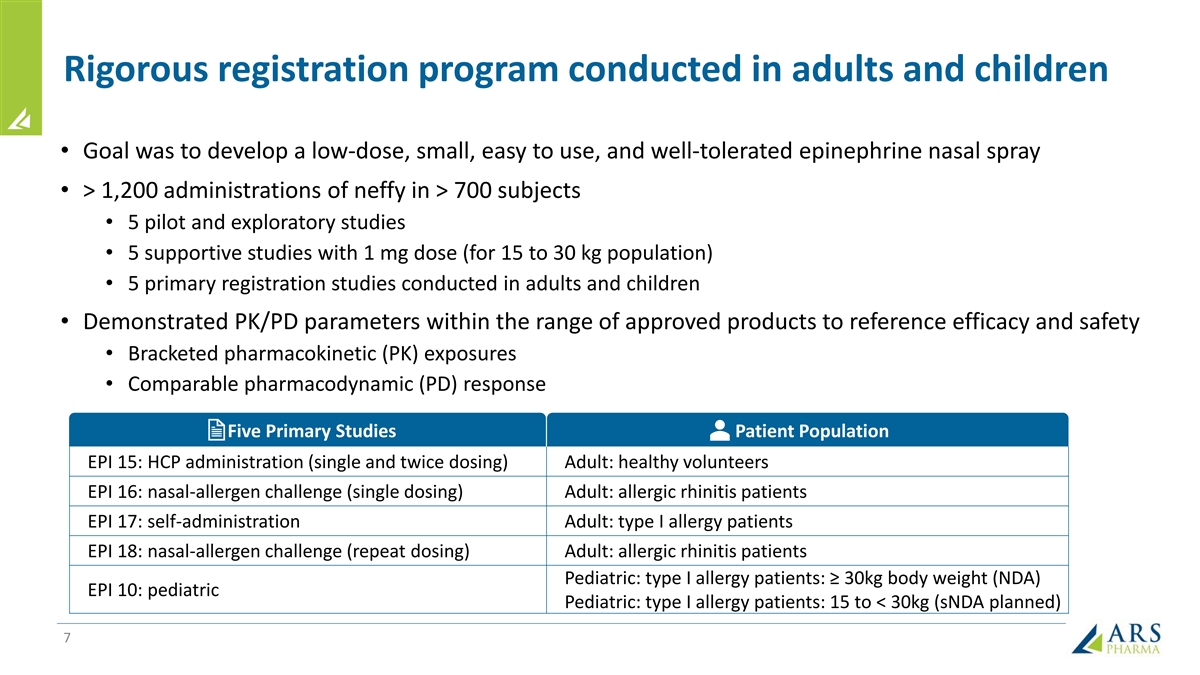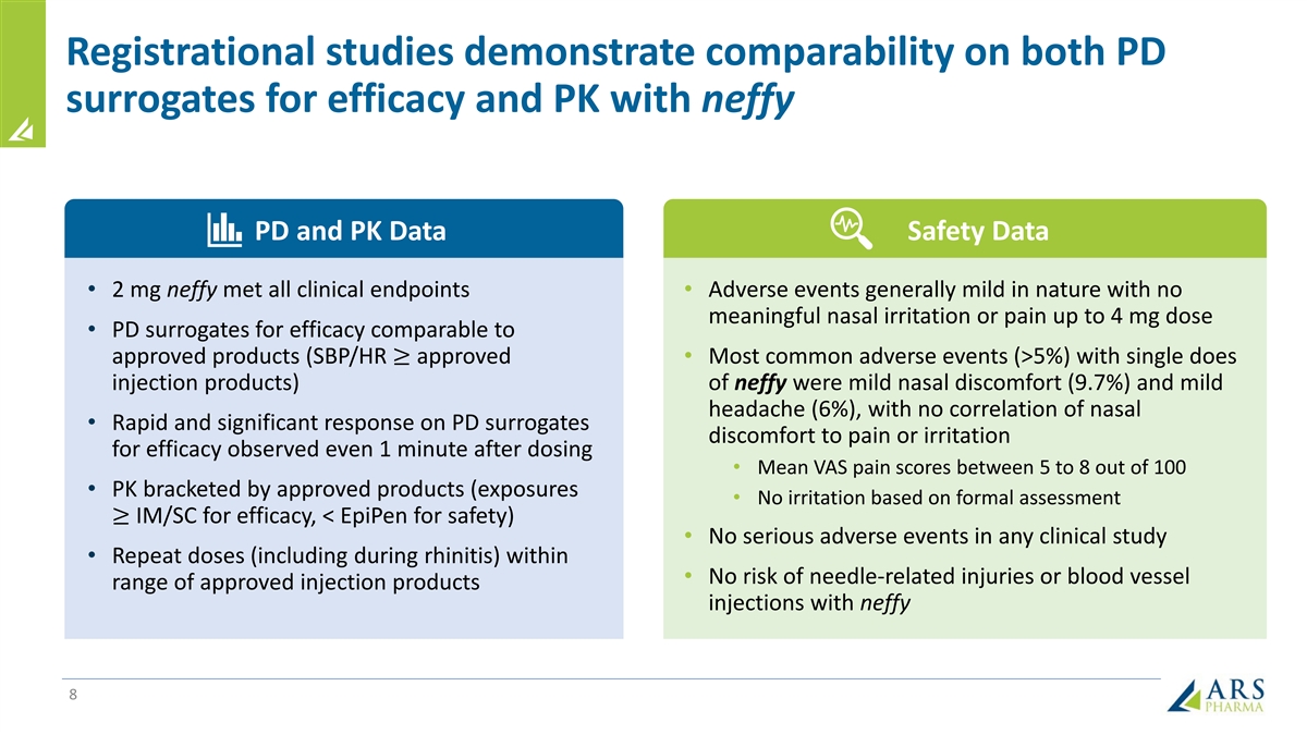 Rigorous registration program conducted in adults and children • Goal was to develop a low-dose, small, easy to use, and well-tolerated epinephrine nasal spray • > 1,200 administrations of neffy in > 700 subjects • 5 pilot and exploratory studies • 5 supportive studies with 1 mg dose (for 15 to 30 kg population) • 5 primary registration studies conducted in adults and children • Demonstrated PK/PD parameters within the range of approved products to reference efficacy and safety • Bracketed pharmacokinetic (PK) exposures • Comparable pharmacodynamic (PD) response Five Primary Studies Patient Population EPI 15: HCP administration (single and twice dosing) Adult: healthy volunteers EPI 16: nasal-allergen challenge (single dosing) Adult: allergic rhinitis patients EPI 17: self-administration Adult: type I allergy patients EPI 18: nasal-allergen challenge (repeat dosing) Adult: allergic rhinitis patients Pediatric: type I allergy patients: ≥ 30kg body weight (NDA) EPI 10: pediatric Pediatric: type I allergy patients: 15 to < 30kg (sNDA planned) 7