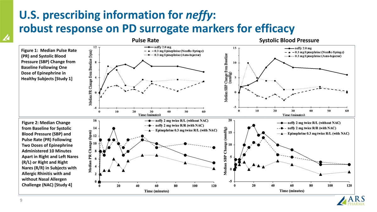 U.S. prescribing information for neffy: robust response on PD surrogate markers for efficacy Pulse Rate Systolic Blood Pressure Figure 1: Median Pulse Rate (PR) and Systolic Blood Pressure (SBP) Change from Baseline Following One Dose of Epinephrine in Healthy Subjects [Study 1] Figure 2: Median Change from Baseline for Systolic Blood Pressure (SBP) and Pulse Rate (PR) Following Two Doses of Epinephrine Administered 10 Minutes Apart in Right and Left Nares (R/L) or Right and Right Nares (R/R) in Subjects with Allergic Rhinitis with and without Nasal Allergen Challenge (NAC) [Study 4] 9