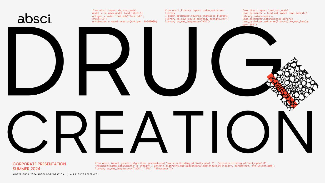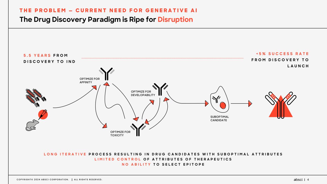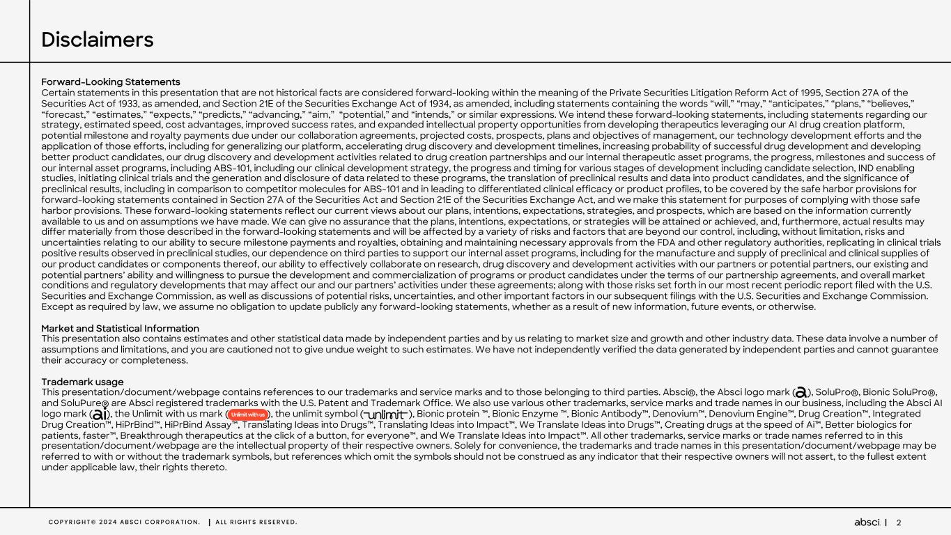 C O P Y R I G H T © 2 0 2 4 A B S C I C O R P O R A T I O N . A L L R I G H T S R E S E R V E D . 2 Disclaimers Forward-Looking Statements Certain statements in this presentation that are not historical facts are considered forward-looking within the meaning of the Private Securities Litigation Reform Act of 1995, Section 27A of the Securities Act of 1933, as amended, and Section 21E of the Securities Exchange Act of 1934, as amended, including statements containing the words “will,” “may,” “anticipates,” “plans,” “believes,” “forecast,” “estimates,” “expects,” “predicts,” “advancing,” “aim,” “potential,” and “intends,” or similar expressions. We intend these forward-looking statements, including statements regarding our strategy, estimated speed, cost advantages, improved success rates, and expanded intellectual property opportunities from developing therapeutics leveraging our AI drug creation platform, potential milestone and royalty payments due under our collaboration agreements, projected costs, prospects, plans and objectives of management, our technology development efforts and the application of those efforts, including for generalizing our platform, accelerating drug discovery and development timelines, increasing probability of successful drug development and developing better product candidates, our drug discovery and development activities related to drug creation partnerships and our internal therapeutic asset programs, the progress, milestones and success of our internal asset programs, including ABS-101, including our clinical development strategy, the progress and timing for various stages of development including candidate selection, IND enabling studies, initiating clinical trials and the generation and disclosure of data related to these programs, the translation of preclinical results and data into product candidates, and the significance of preclinical results, including in comparison to competitor molecules for ABS-101 and in leading to differentiated clinical efficacy or product profiles, to be covered by the safe harbor provisions for forward-looking statements contained in Section 27A of the Securities Act and Section 21E of the Securities Exchange Act, and we make this statement for purposes of complying with those safe harbor provisions. These forward-looking statements reflect our current views about our plans, intentions, expectations, strategies, and prospects, which are based on the information currently available to us and on assumptions we have made. We can give no assurance that the plans, intentions, expectations, or strategies will be attained or achieved, and, furthermore, actual results may differ materially from those described in the forward-looking statements and will be affected by a variety of risks and factors that are beyond our control, including, without limitation, risks and uncertainties relating to our ability to secure milestone payments and royalties, obtaining and maintaining necessary approvals from the FDA and other regulatory authorities, replicating in clinical trials positive results observed in preclinical studies, our dependence on third parties to support our internal asset programs, including for the manufacture and supply of preclinical and clinical supplies of our product candidates or components thereof, our ability to effectively collaborate on research, drug discovery and development activities with our partners or potential partners, our existing and potential partners’ ability and willingness to pursue the development and commercialization of programs or product candidates under the terms of our partnership agreements, and overall market conditions and regulatory developments that may affect our and our partners’ activities under these agreements; along with those risks set forth in our most recent periodic report filed with the U.S. Securities and Exchange Commission, as well as discussions of potential risks, uncertainties, and other important factors in our subsequent filings with the U.S. Securities and Exchange Commission. Except as required by law, we assume no obligation to update publicly any forward-looking statements, whether as a result of new information, future events, or otherwise. Market and Statistical Information This presentation also contains estimates and other statistical data made by independent parties and by us relating to market size and growth and other industry data. These data involve a number of assumptions and limitations, and you are cautioned not to give undue weight to such estimates. We have not independently verified the data generated by independent parties and cannot guarantee their accuracy or completeness. Trademark usage This presentation/document/webpage contains references to our trademarks and service marks and to those belonging to third parties. Absci®, the Absci logo mark ( ), SoluPro®, Bionic SoluPro®, and SoluPure® are Absci registered trademarks with the U.S. Patent and Trademark Office. We also use various other trademarks, service marks and trade names in our business, including the Absci AI logo mark ( ), the Unlimit with us mark ( ), the unlimit symbol ( ), Bionic protein ™, Bionic Enzyme ™, Bionic Antibody™, Denovium™, Denovium Engine™, Drug Creation™, Integrated Drug Creation™, HiPrBind™, HiPrBind Assay™, Translating Ideas into Drugs™, Translating Ideas into Impact™, We Translate Ideas into Drugs™, Creating drugs at the speed of Ai™, Better biologics for patients, faster™, Breakthrough therapeutics at the click of a button, for everyone™, and We Translate Ideas into Impact™. All other trademarks, service marks or trade names referred to in this presentation/document/webpage are the intellectual property of their respective owners. Solely for convenience, the trademarks and trade names in this presentation/document/webpage may be referred to with or without the trademark sym
