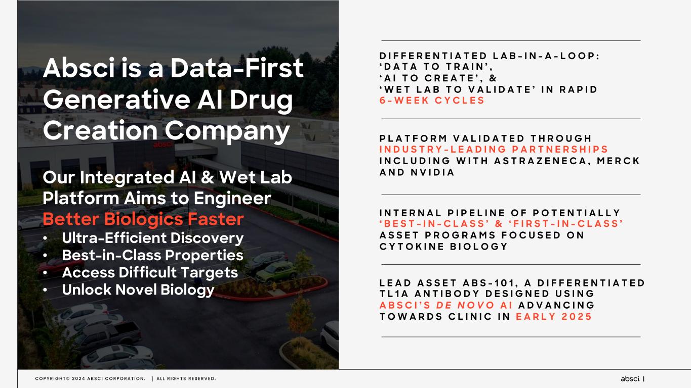 C O P Y R I G H T © 2 0 2 4 A B S C I C O R P O R A T I O N . A L L R I G H T S R E S E R V E D . Absci is a Data-First Generative AI Drug Creation Company Our Integrated AI & Wet Lab Platform Aims to Engineer Better Biologics Faster • Ultra-Efficient Discovery • Best-in-Class Properties • Access Difficult Targets • Unlock Novel Biology P L A T F O R M V A L I D A T E D T H R O U G H I N D U S T R Y - L E A D I N G P A R T N E R S H I P S I N C L U D I N G W I T H A S T R A Z E N E C A , M E R C K A N D N V I D I A D I F F E R E N T I A T E D L A B - I N - A - L O O P : ‘ D A T A T O T R A I N ’ , ‘ A I T O C R E A T E ’ , & ‘ W E T L A B T O V A L I D A T E ’ I N R A P I D 6 - W E E K C Y C L E S I N T E R N A L P I P E L I N E O F P O T E N T I A L L Y ‘ B E S T - I N - C L A S S ’ & ‘ F I R S T - I N - C L A S S ’ A S S E T P R O G R A M S F O C U S E D O N C Y T O K I N E B I O L O G Y L E A D A S S E T A B S - 1 0 1 , A D I F F E R E N T I A T E D T L 1 A A N T I B O D Y D E S I G N E D U S I N G A B S C I ’ S D E N O V O A I A D V A N C I N G T O W A R D S C L I N I C I N E A R L Y 2 0 2 5