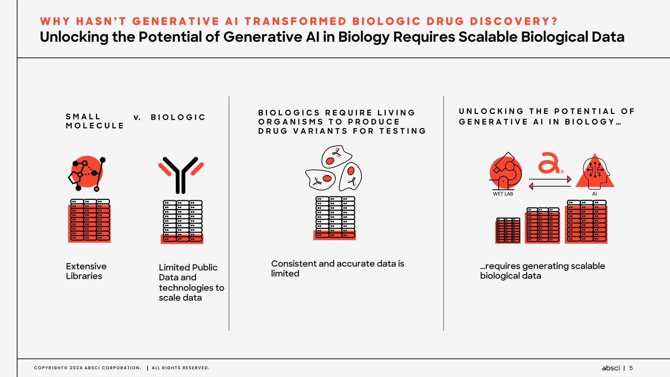 C O P Y R I G H T © 2 0 2 4 A B S C I C O R P O R A T I O N . A L L R I G H T S R E S E R V E D . 4 L O N G I T E R A T I V E P R O C E S S R E S U L T I N G I N D R U G C A N D I D A T E S W I T H S U B O P T I M A L A T T R I B U T E S L I M I T E D C O N T R O L O F A T T R I B U T E S O F T H E R A P E U T I C S N O A B I L I T Y T O S E L E C T E P I T O P E 5 . 5 Y E A R S F R O M D I S C O V E R Y T O I N D OPTIMIZE FOR AFFINITY OPTIMIZE FOR TOXICITY OPTIMIZE FOR DEVELOPABILITY SUBOPTIMAL CANDIDATE < 5 % S U C C E S S R A T E F R O M D I S C O V E R Y T O L A U N C H The Drug Discovery Paradigm is Ripe for Disruption T H E P R O B L E M — C U R R E N T N E E D F O R G E N E R A T I V E A I