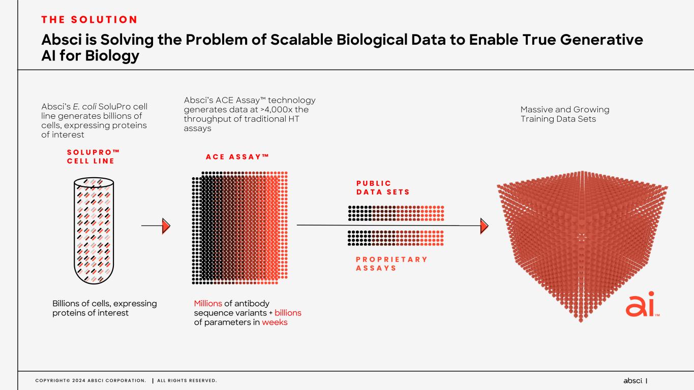 C O P Y R I G H T © 2 0 2 4 A B S C I C O R P O R A T I O N . A L L R I G H T S R E S E R V E D . T H E S O L U T I O N Absci’s E. coli SoluPro cell line generates billions of cells, expressing proteins of interest Absci’s ACE Assay™ technology generates data at >4,000x the throughput of traditional HT assays Massive and Growing Training Data Sets S O L U P R O ™ C E L L L I N E A C E A S S A Y ™ Billions of cells, expressing proteins of interest Millions of antibody sequence variants + billions of parameters in weeks P R O P R I E T A R Y A S S A Y S P U B L I C D A T A S E T S Absci is Solving the Problem of Scalable Biological Data to Enable True Generative AI for Biology