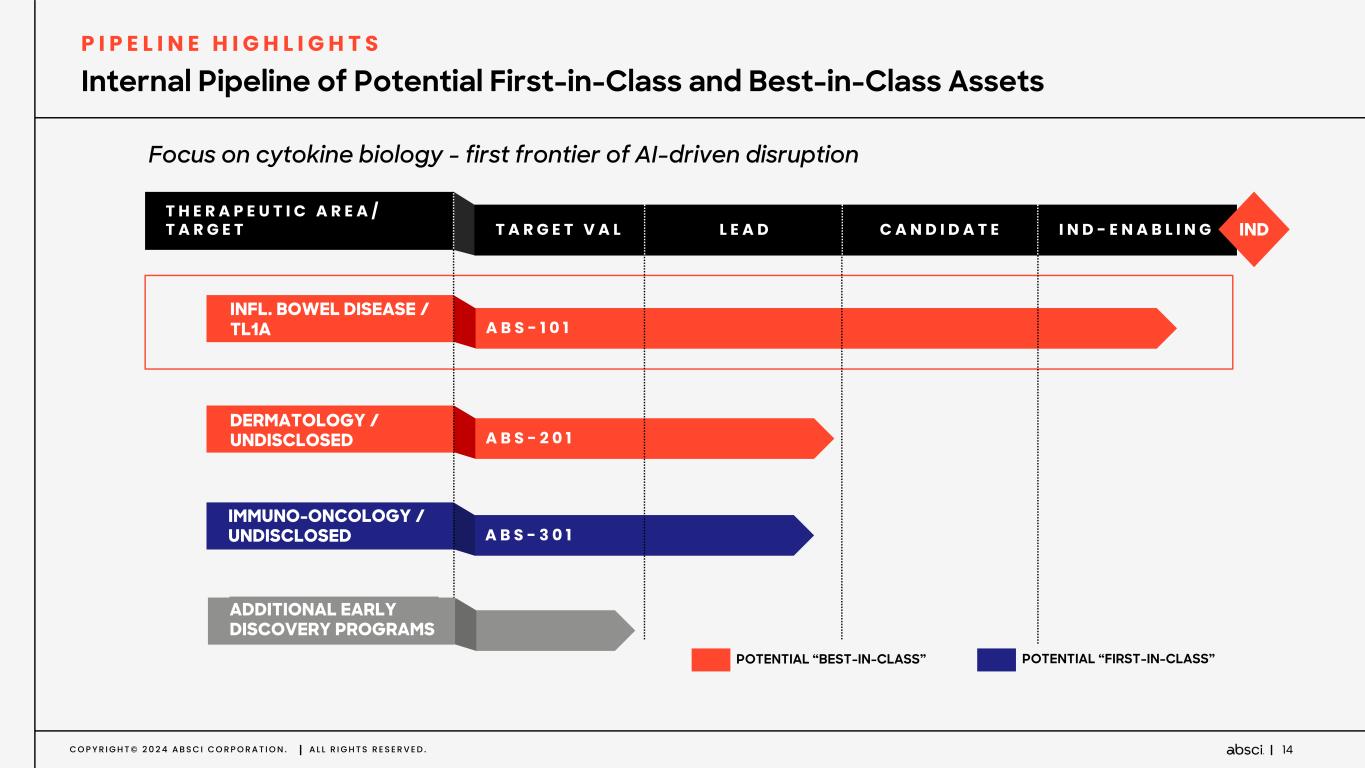 C O P Y R I G H T © 2 0 2 4 A B S C I C O R P O R A T I O N . A L L R I G H T S R E S E R V E D . 13 Platform Enables the Potential to Deliver Differentiated Biologics, Faster at Lower Cost V A L U E D R I V E R S ENABLING FIRST-IN-CLASS A C C E S S N O V E L D I S E A S E B I O L O G Y Ability to address elusive drug targets, e.g. GPCRs, Ion Channels ENABLING BEST IN CLASS & HIGHER PROGRAM NPVS I N C R E A S E D P R O B A B I L I T Y O F S U C C E S S Superior Drug Attributes and Multidimensional optimization creates higher quality biologics ENHANCED IP PROTECTION E X P A N D E D I N T E L L E C T U A L P R O P E R T Y S P A C E Generates broader IP for First-in-Class therapies and finds new IP for Best-in-Class therapies FASTER TIME TO IND R E D U C E D T I M E & C O S T T O C L I N I C 2 years and $14-16M from Target to IND; significant reduction compared to industry estimates