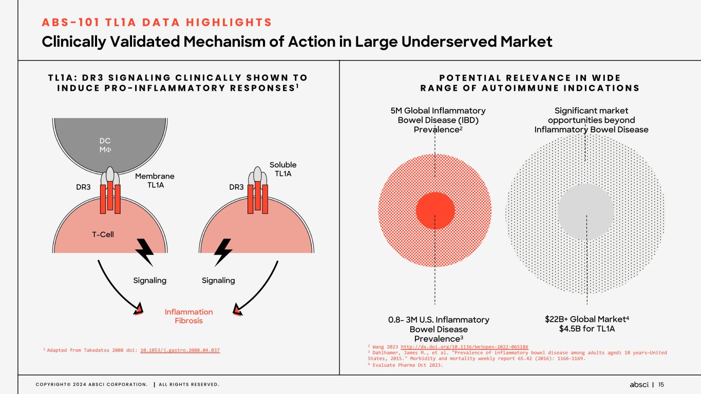 C O P Y R I G H T © 2 0 2 4 A B S C I C O R P O R A T I O N . A L L R I G H T S R E S E R V E D . 14 Internal Pipeline of Potential First-in-Class and Best-in-Class Assets P I P E L I N E H I G H L I G H T S POTENTIAL “BEST-IN-CLASS” POTENTIAL “FIRST-IN-CLASS” DERMATOLOGY / UNDISCLOSED INFL. BOWEL DISEASE / TL1A IMMUNO-ONCOLOGY / UNDISCLOSED A B S - 2 0 1 A B S - 3 0 1 A B S - 1 0 1 T A R G E T V A L L E A D C A N D I D A T E I N D - E N A B L I N G T H E R A P E U T I C A R E A / T A R G E T IND Focus on cytokine biology - first frontier of AI-driven disruption ADDITIONAL EARLY DISCOVERY PROGRAMS