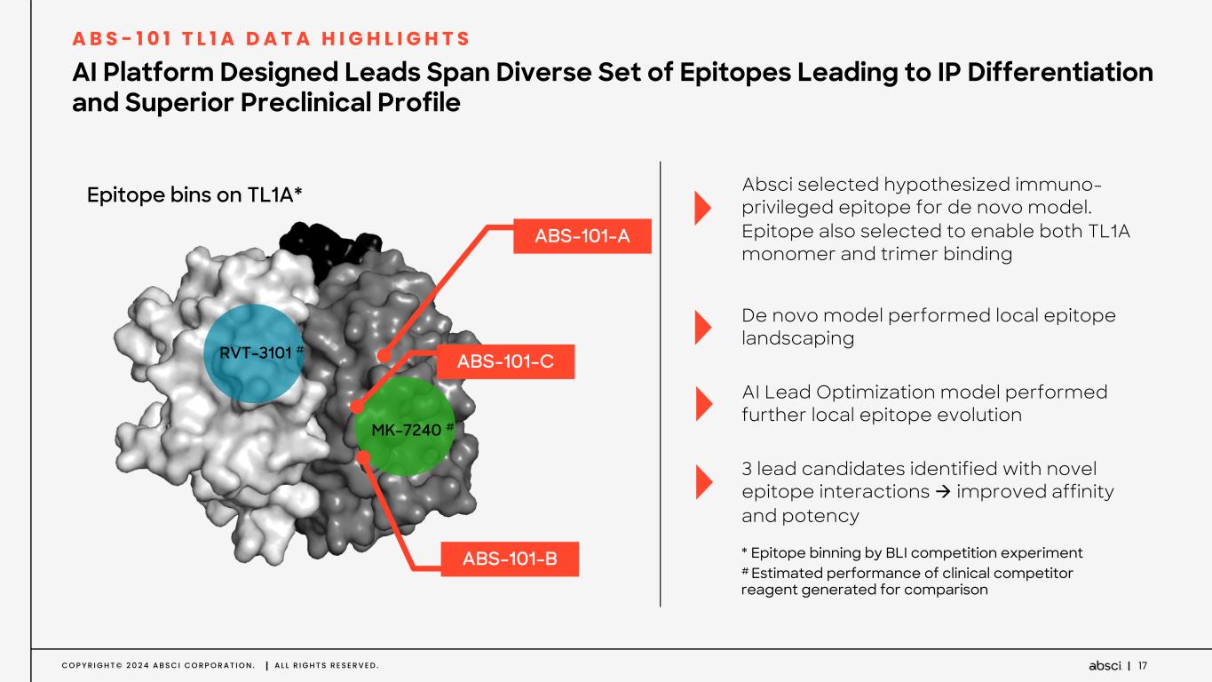 C O P Y R I G H T © 2 0 2 4 A B S C I C O R P O R A T I O N . A L L R I G H T S R E S E R V E D . 16 Potential Best-in-Class TL1A mAb Designed using Generative AI A B S - 1 0 1 T L 1 A D A T A H I G H L I G H T S AI-designed TL1A program designed to achieve superior therapeutic properties over clinical competitors D E N O V O A I - D E S I G N E D A N D A I - O P T I M I Z E D S U P E R I O R P R E - C L I N I C A L P R O F I L E A N D P O T E N T I A L F O R S U P E R I O R C L I N I C A L P R O F I L E D I F F E R E N T I A T E D I N T E L L E C T U A L P R O P E R T Y • High Affinity & Potency • High affinity to both the TL1A trimer and monomers • Extended Half-life & Longer Dosing Intervals • Q8W to once quarterly • Low immunogenicity • Sub-Q Dosing • High bioavailability • Favorable Developability • Target to promising candidates in just over 1 year