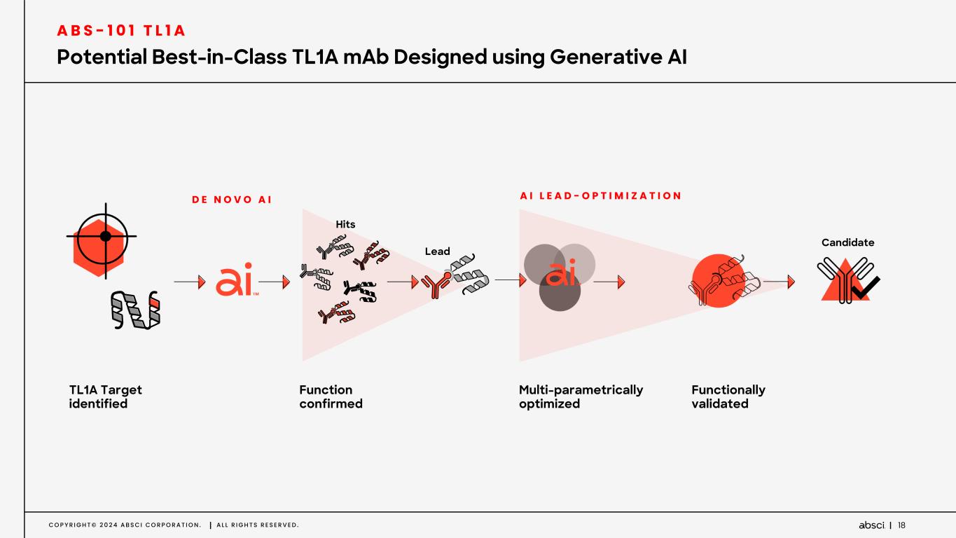 C O P Y R I G H T © 2 0 2 4 A B S C I C O R P O R A T I O N . A L L R I G H T S R E S E R V E D . 17 AI Platform Designed Leads Span Diverse Set of Epitopes Leading to IP Differentiation and Superior Preclinical Profile A B S - 1 0 1 T L 1 A D A T A H I G H L I G H T S * Epitope binning by BLI competition experiment # Estimated performance of clinical competitor reagent generated for comparison De novo model performed local epitope landscaping Absci selected hypothesized immuno- privileged epitope for de novo model. Epitope also selected to enable both TL1A monomer and trimer binding AI Lead Optimization model performed further local epitope evolution 3 lead candidates identified with novel epitope interactions à improved affinity and potency MK-7240 # RVT-3101 # Epitope bins on TL1A* ABS-101-A ABS-101-B ABS-101-C