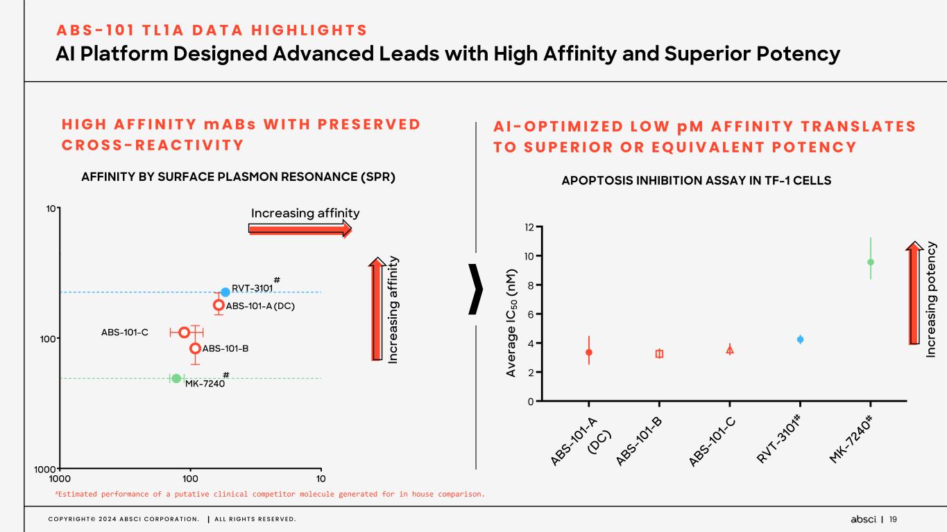 C O P Y R I G H T © 2 0 2 4 A B S C I C O R P O R A T I O N . A L L R I G H T S R E S E R V E D . 18 TL1A Target identified Function confirmed Multi-parametrically optimized Functionally validated D E N O V O A I A I L E A D - O P T I M I Z A T I O N Hits Lead Candidate Potential Best-in-Class TL1A mAb Designed using Generative AI A B S - 1 0 1 T L 1 A