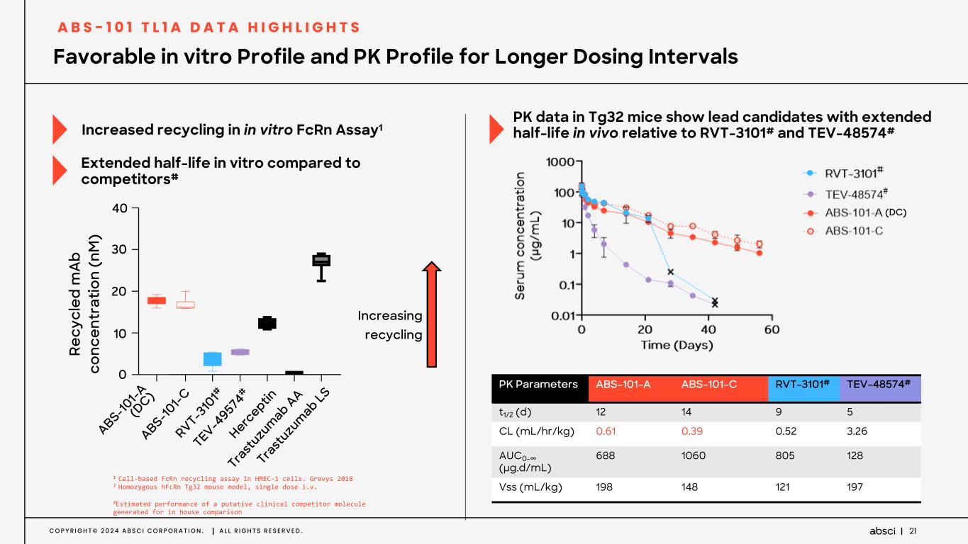 C O P Y R I G H T © 2 0 2 4 A B S C I C O R P O R A T I O N . A L L R I G H T S R E S E R V E D . 20 AI Epitope Selection Enables High Affinity to Both the TL1A Monomer and Trimer E P I T O P E S E L E C T E D E N A B L E D H I G H A F F I N I T Y B I N D I N G T O B O T H T H E T L 1 A M O N O M E R A N D T R I M E R #Estimated performance of clinical competitor reagent generated for in-house comparison. 1 We used BLI values for comparing monomer and trimer binding and not as absolute values due to sensitivity limits for the instrument at high affinity. SPR-based absolute affinities reported in the previous slide are considered more accurate. For samples, such as RVT-3101#, the observed difference in affinities measured by SPR and BLI are within the error expected for picomolar binders by BLI. A B S - 1 0 1 T L 1 A D A T A H I G H L I G H T S In cr ea si ng a ff in ity Increasing affinity RVT-3101 MK-7240 TEV-48574 ABS-101-C ABS-101-A ABS-101-B # # # (DC)