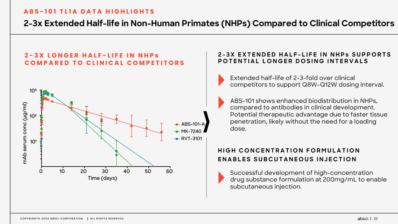C O P Y R I G H T © 2 0 2 4 A B S C I C O R P O R A T I O N . A L L R I G H T S R E S E R V E D . 21 Favorable in vitro Profile and PK Profile for Longer Dosing Intervals Extended half-life in vitro compared to competitors# Increased recycling in in vitro FcRn Assay1 PK data in Tg32 mice show lead candidates with extended half-life in vivo relative to RVT-3101# and TEV-48574# PK Parameters ABS-101-A ABS-101-C RVT-3101# TEV-48574# t1/2 (d) 12 14 9 5 CL (mL/hr/kg) 0.61 0.39 0.52 3.26 AUC0-∞ (µg.d/mL) 688 1060 805 128 Vss (mL/kg) 198 148 121 197 1 Cell-based FcRn recycling assay in HMEC-1 cells. Grevys 2018 2 Homozygous hFcRn Tg32 mouse model, single dose i.v. #Estimated performance of a putative clinical competitor molecule generated for in house comparison Increasing recycling Re cy cl ed m A b co nc en tr at io n (n M ) ABS-10 1-A (D C) RVT-3 10 1# 10 20 0 ABS-10 1-C 30 40 TEV-4 9574# Herc eptin Tra st uzum ab A A Tra st uzum ab LS A B S - 1 0 1 T L 1 A D A T A H I G H L I G H T S (DC)