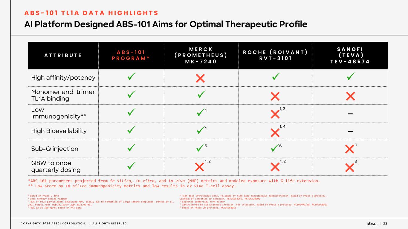 C O P Y R I G H T © 2 0 2 4 A B S C I C O R P O R A T I O N . A L L R I G H T S R E S E R V E D . 22 A B S - 1 0 1 T L 1 A D A T A H I G H L I G H T S Extended half-life of 2-3-fold over clinical competitors to support Q8W-Q12W dosing interval. ABS-101 shows enhanced biodistribution in NHPs, compared to antibodies in clinical development. Potential therapeutic advantage due to faster tissue penetration, likely without the need for a loading dose. Successful development of high-concentration drug substance formulation at 200mg/mL to enable subcutaneous injection. 2-3x Extended Half-life in Non-Human Primates (NHPs) Compared to Clinical Competitors 2 - 3 X E X T E N D E D H A L F - L I F E I N N H P s S U P P O R T S P O T E N T I A L L O N G E R D O S I N G I N T E R V A L S H I G H C O N C E N T R A T I O N F O R M U L A T I O N E N A B L E S S U B C U T A N E O U S I N J E C T I O N 2 - 3 X L O N G E R H A L F - L I F E I N N H P s C O M P A R E D T O C L I N I C A L C O M P E T I T O R S m A b se ru m c on c (µ g/ m l) Time (days) 0 10 20 30 40 50 60 10¹ 10² 10³ ABS-101-A MK-7240 RVT-3101