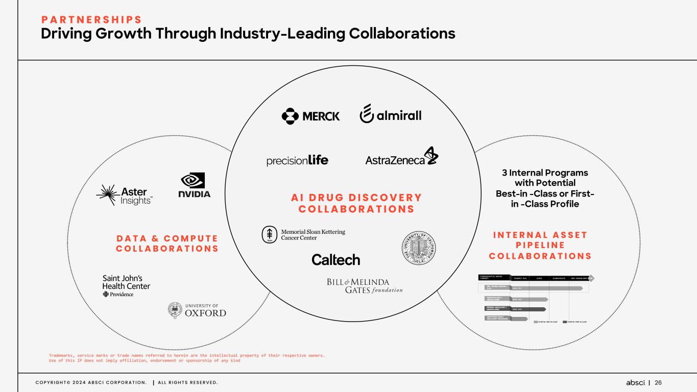C O P Y R I G H T © 2 0 2 4 A B S C I C O R P O R A T I O N . A L L R I G H T S R E S E R V E D . 25 Over $900M + Royalties of Deal Value in H2 2023 R E C E N T P A R T N E R S H I P S “This collaboration is an exciting opportunity to utilize Absci's de novo AI antibody creation platform to design a potential new antibody therapy in oncology." D R . P U J A S A P R A AstraZeneca, SVP, Biologics Engineering & Oncology Targeted Delivery “Almirall chose Absci because their de novo platform brings truly novel innovation in solving the industry’s most challenging targets facing high unmet medical need.” Almirall, Chief Scientific Officer and EVP of Research & Development D R . K A R L Z I E G E L B A U E R R&D CLINICAL COMMERCIAL ROYALTIES I L L U S T R A T I V E E C O N O M I C S T R U C T U R E O F A S U C C E S S F U L D R U G D I S C O V E R Y P A R T N E R S H I P UPFRONT & RESEARCH FUNDING CLINICAL MILESTONES COMMERCIAL MILESTONES & ROYALTIES