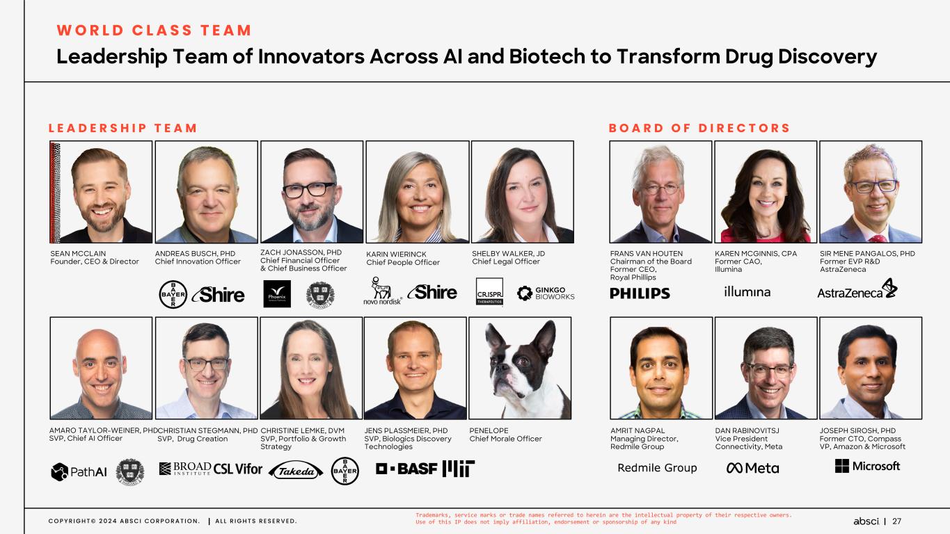 C O P Y R I G H T © 2 0 2 4 A B S C I C O R P O R A T I O N . A L L R I G H T S R E S E R V E D . 26 P A R T N E R S H I P S A I D R U G D I S C O V E R Y C O L L A B O R A T I O N S I N T E R N A L A S S E T P I P E L I N E C O L L A B O R A T I O N S D A T A & C O M P U T E C O L L A B O R A T I O N S Trademarks, service marks or trade names referred to herein are the intellectual property of their respective owners. Use of this IP does not imply affiliation, endorsement or sponsorship of any kind 3 Internal Programs with Potential Best-in -Class or First- in -Class Profile Driving Growth Through Industry-Leading Collaborations