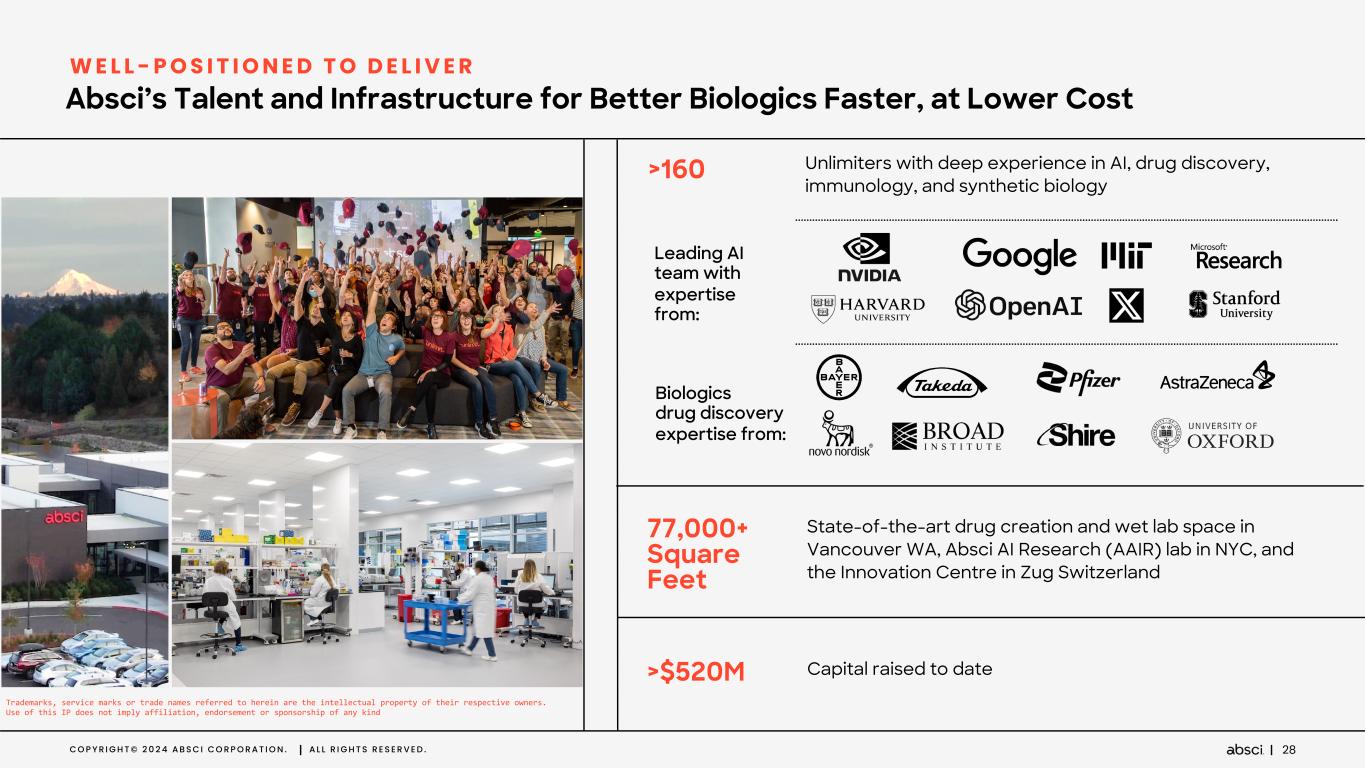 C O P Y R I G H T © 2 0 2 4 A B S C I C O R P O R A T I O N . A L L R I G H T S R E S E R V E D . 27 Leadership Team of Innovators Across AI and Biotech to Transform Drug Discovery W O R L D C L A S S T E A M Trademarks, service marks or trade names referred to herein are the intellectual property of their respective owners. Use of this IP does not imply affiliation, endorsement or sponsorship of any kind KAREN MCGINNIS, CPA Former CAO, Illumina AMRIT NAGPAL Managing Director, Redmile Group JOSEPH SIROSH, PHD Former CTO, Compass VP, Amazon & Microsoft DAN RABINOVITSJ Vice President Connectivity, Meta FRANS VAN HOUTEN Chairman of the Board Former CEO, Royal Phillips B O A R D O F D I R E C T O R S SIR MENE PANGALOS, PHD Former EVP R&D AstraZeneca L E A D E R S H I P T E A M SEAN MCCLAIN Founder, CEO & Director ANDREAS BUSCH, PHD Chief Innovation Officer ZACH JONASSON, PHD Chief Financial Officer & Chief Business Officer AMARO TAYLOR-WEINER, PHD SVP, Chief AI Officer KARIN WIERINCK Chief People Officer CHRISTIAN STEGMANN, PHD SVP, Drug Creation CHRISTINE LEMKE, DVM SVP, Portfolio & Growth Strategy JENS PLASSMEIER, PHD SVP, Biologics Discovery Technologies PENELOPE Chief Morale Officer SHELBY WALKER, JD Chief Legal Officer