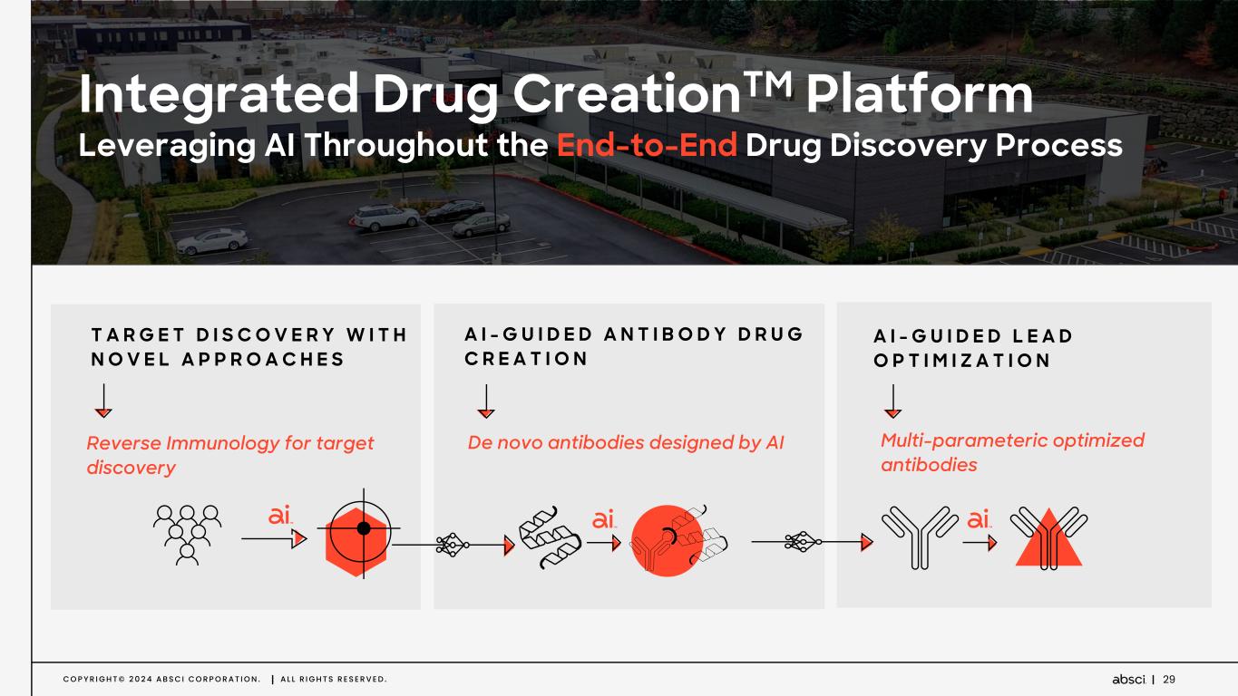 C O P Y R I G H T © 2 0 2 4 A B S C I C O R P O R A T I O N . A L L R I G H T S R E S E R V E D . 30 de novo Designed Antibodies de novo antibody design using generative AI T A R G E T D I S C O V E R Y W I T H N O V E L A P P R O A C H E S Reverse Immunology for target discovery A I - G U I D E D L E A D O P T I M I Z A T I O N Multi-parameteric optimized antibodies A I - G U I D E D A N T I B O D Y D R U G C R E A T I O N De novo antibodies designed by AI