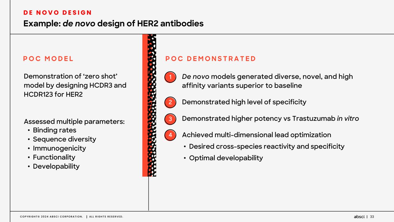 C O P Y R I G H T © 2 0 2 4 A B S C I C O R P O R A T I O N . A L L R I G H T S R E S E R V E D . 32 Antibody scaffold sequence De novo antibody designs Wet lab assays ACE Assay™ data SPR assay data Target antigen structure Validated de novo binders Target epitope Antibody scaffold sequence De novo drug creation with ‘zero-shot’ generative AI Zero-Shot: Model has never seen an antibody that binds to the target or homologs Binders were identified straight out of the model – no lead optimization was performed
