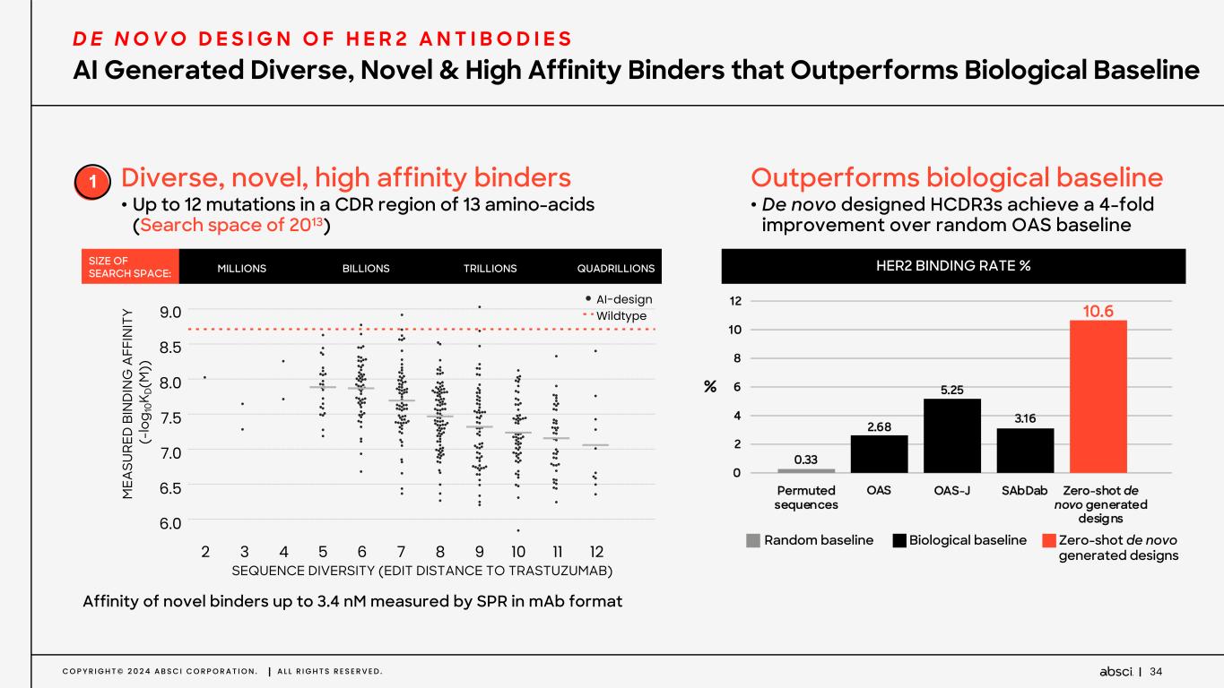 C O P Y R I G H T © 2 0 2 4 A B S C I C O R P O R A T I O N . A L L R I G H T S R E S E R V E D . 33 Example: de novo design of HER2 antibodies Demonstration of ‘zero shot’ model by designing HCDR3 and HCDR123 for HER2 Assessed multiple parameters: • Binding rates • Sequence diversity • Immunogenicity • Functionality • Developability P O C D E M O N S T R A T E D 1. De novo models generated diverse, novel, and high affinity variants superior to baseline 2. Demonstrated high level of specificity 3. Demonstrated higher potency vs Trastuzumab in vitro 4. Achieved multi-dimensional lead optimization • Desired cross-species reactivity and specificity • Optimal developability P O C M O D E L D E N O V O D E S I G N
