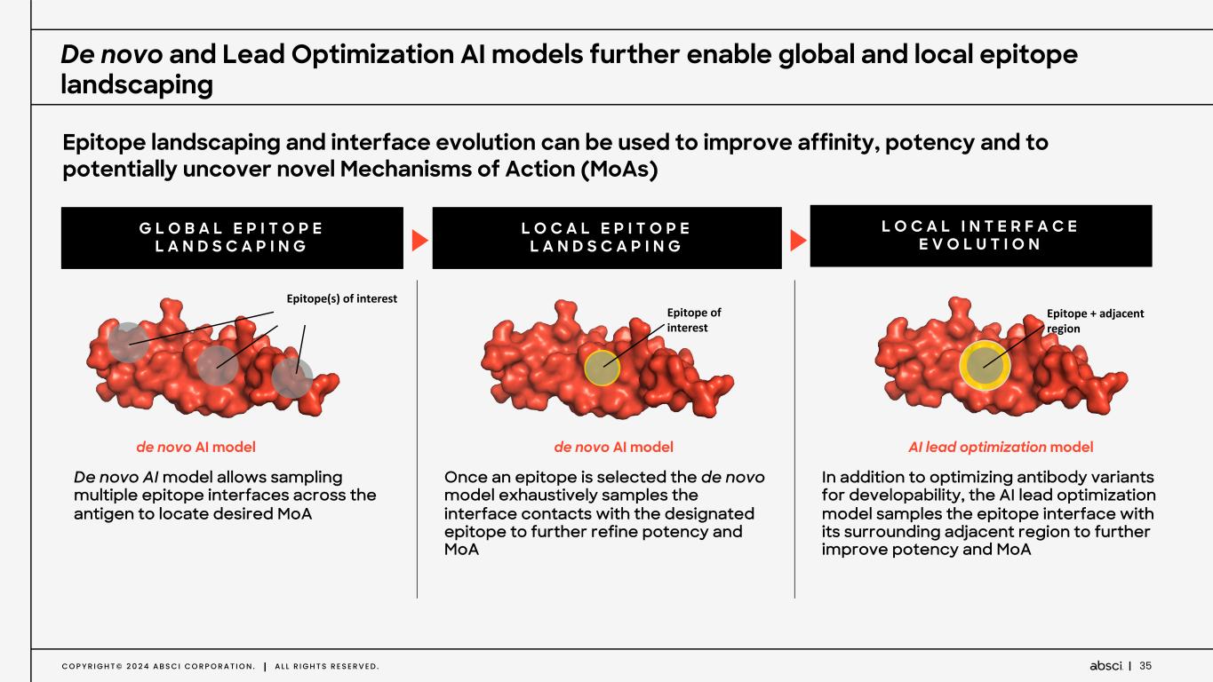 C O P Y R I G H T © 2 0 2 4 A B S C I C O R P O R A T I O N . A L L R I G H T S R E S E R V E D . 34 AI Generated Diverse, Novel & High Affinity Binders that Outperforms Biological Baseline D E N O V O D E S I G N O F H E R 2 A N T I B O D I E S SIZE OF SEARCH SPACE: MILLIONS BILLIONS TRILLIONS QUADRILLIONS 9.0 8.5 8.0 7.5 7.0 6.5 6.0 2 3 4 5 6 7 8 9 10 11 12 M EA SU RE D B IN D IN G A FF IN IT Y (- lo g 1 0K D (M )) SEQUENCE DIVERSITY (EDIT DISTANCE TO TRASTUZUMAB) AI-design Wildtype Diverse, novel, high affinity binders • Up to 12 mutations in a CDR region of 13 amino-acids (Search space of 2013) Outperforms biological baseline • De novo designed HCDR3s achieve a 4-fold improvement over random OAS baseline Affinity of novel binders up to 3.4 nM measured by SPR in mAb format HER2 BINDING RATE % Random baseline Biological baseline Zero-shot de novo generated designs 1