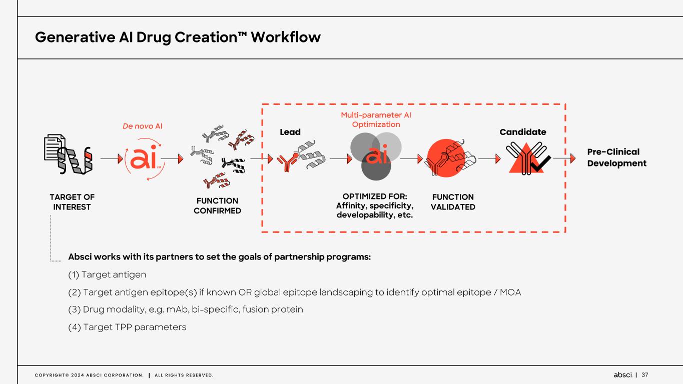 C O P Y R I G H T © 2 0 2 4 A B S C I C O R P O R A T I O N . A L L R I G H T S R E S E R V E D . 36 AI-Guided Lead Optimization From de novo design to multiparametric lead optimization using AI T A R G E T D I S C O V E R Y W I T H N O V E L A P P R O A C H E S Reverse Immunology for target discovery A I - G U I D E D L E A D O P T I M I Z A T I O N Multi-parameteric optimized antibodies A I - G U I D E D A N T I B O D Y D R U G C R E A T I O N De novo antibodies designed by AI