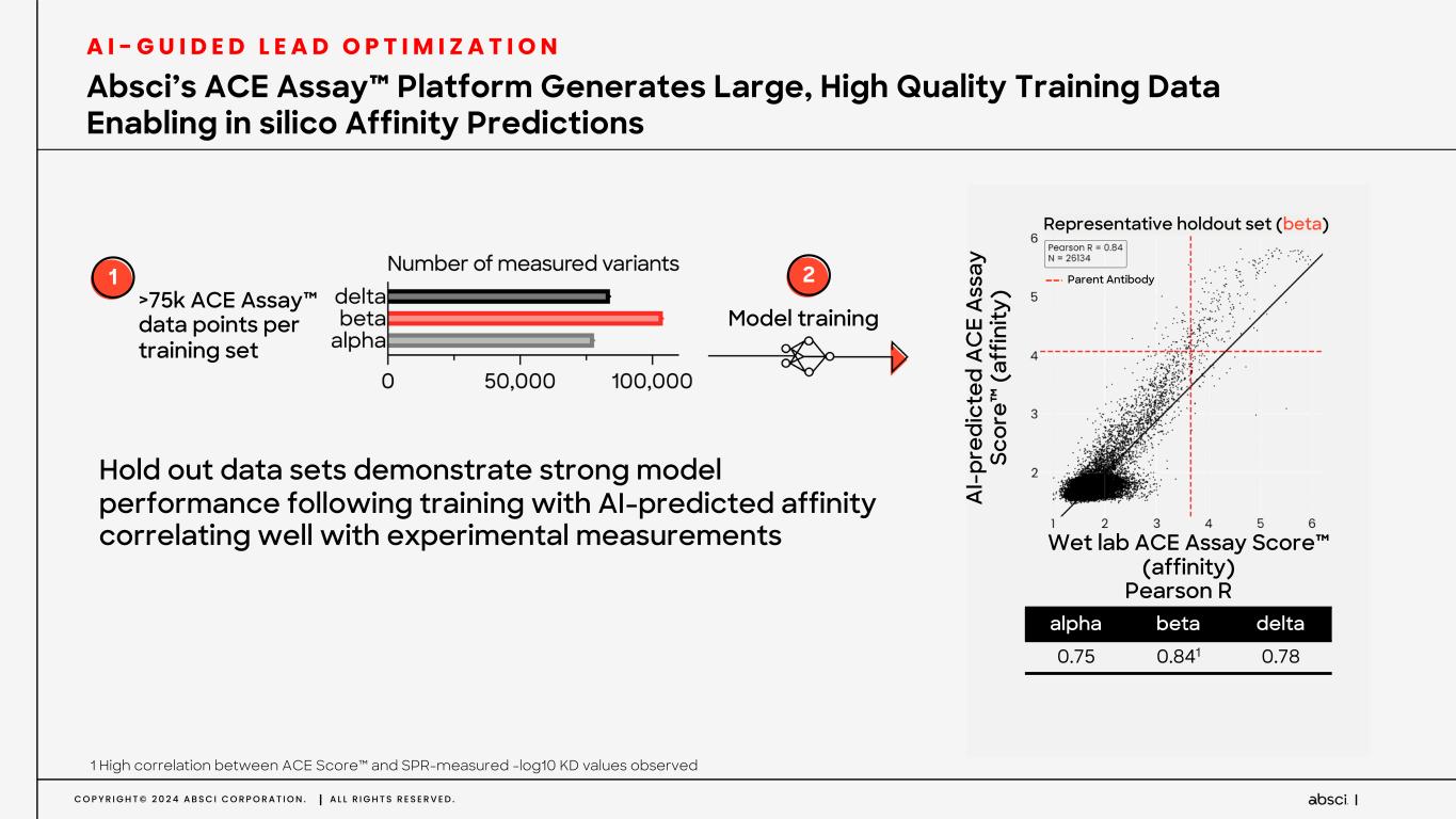 C O P Y R I G H T © 2 0 2 4 A B S C I C O R P O R A T I O N . A L L R I G H T S R E S E R V E D . Model training Hold out data sets demonstrate strong model performance following training with AI-predicted affinity correlating well with experimental measurements >75k ACE Assay™ data points per training set Representative holdout set (beta) alpha beta delta 0.75 0.841 0.78 Pearson R Parent Antibody A I- pr ed ic te d A C E A ss ay Sc or e™ (a ff in ity ) Wet lab ACE Assay Score™ (affinity) 1 2 1 High correlation between ACE Score™ and SPR-measured -log10 KD values observed Absci’s ACE Assay™ Platform Generates Large, High Quality Training Data Enabling in silico Affinity Predictions A I - G U I D E D L E A D O P T I M I Z A T I O N
