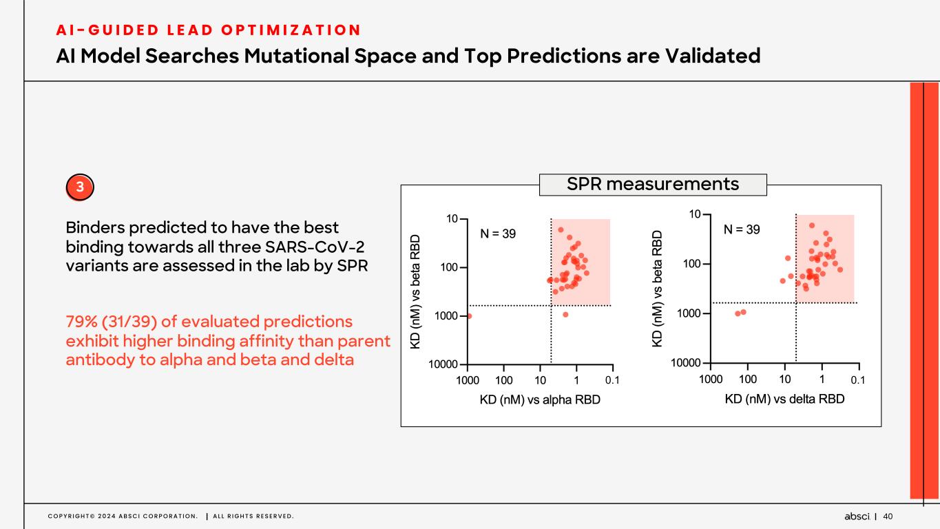 C O P Y R I G H T © 2 0 2 4 A B S C I C O R P O R A T I O N . A L L R I G H T S R E S E R V E D . 38 Re-engineer clinically approved antibody for binding towards three SARS-CoV-2 variants Improve binding towards beta without loss of binding towards alpha and delta alpha N501Y N501Y beta L452R E484QE484K K417N/T delta SARS-CoV-2 variant mutations in the receptor binding domain (RBD) SARS-CoV-2 RBD Epitope residues Strain mutations Fab KD (nM) WT RBD alpha RBD beta RBD delta RBD Parental Antibody 8.5 8.0 607 5.4 Case study goals AI multi-valent co-optimization of a broad-spectrum SARS-CoV-2 antibody A I - G U I D E D L E A D O P T I M I Z A T I O N