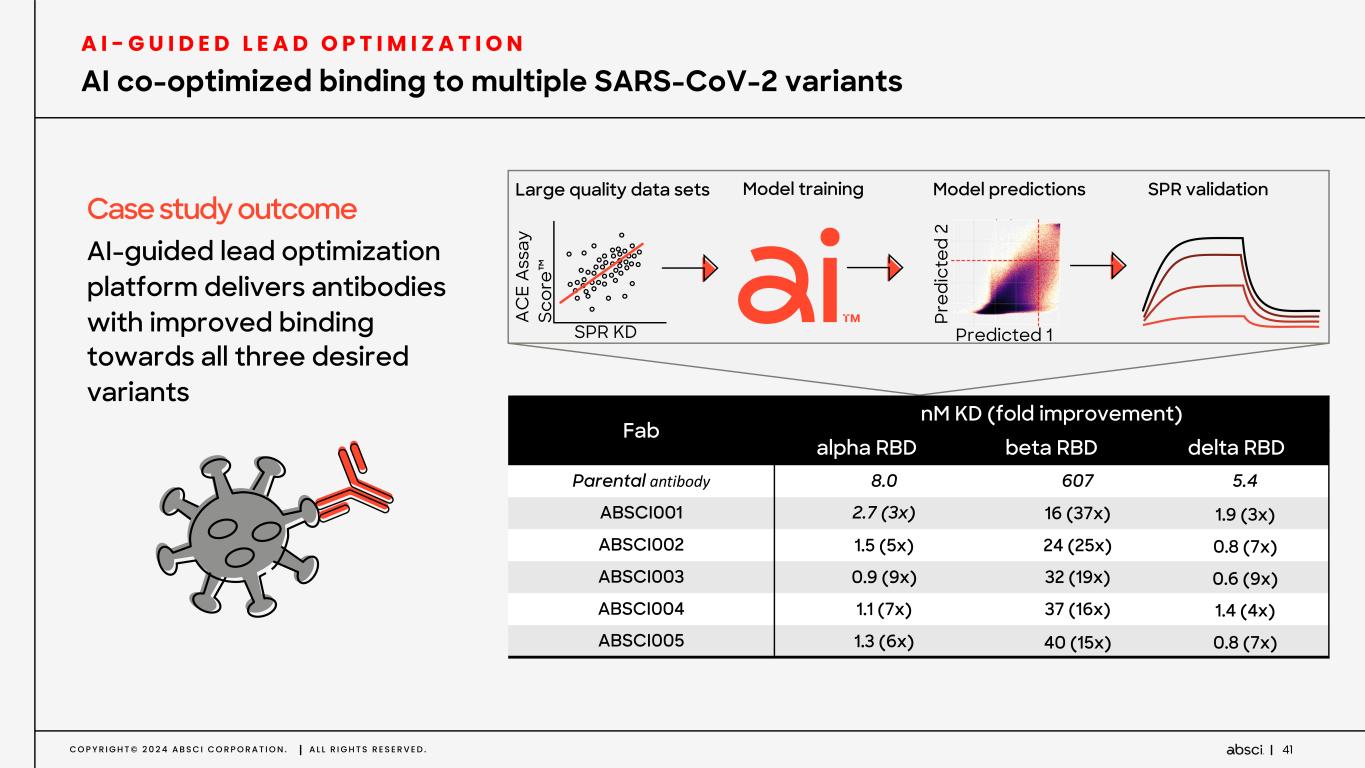 C O P Y R I G H T © 2 0 2 4 A B S C I C O R P O R A T I O N . A L L R I G H T S R E S E R V E D . 41 SPR KD A C E A ss ay Sc or e™ Large quality data sets Model training Model predictions SPR validation Predicted 1 Pr ed ic te d 2 Fab nM KD (fold improvement) alpha RBD beta RBD delta RBD Parental antibody 8.0 607 5.4 ABSCI001 2.7 (3x) 16 (37x) 1.9 (3x) ABSCI002 1.5 (5x) 24 (25x) 0.8 (7x) ABSCI003 0.9 (9x) 32 (19x) 0.6 (9x) ABSCI004 1.1 (7x) 37 (16x) 1.4 (4x) ABSCI005 1.3 (6x) 40 (15x) 0.8 (7x) AI-guided lead optimization platform delivers antibodies with improved binding towards all three desired variants Case study outcome AI co-optimized binding to multiple SARS-CoV-2 variants A I - G U I D E D L E A D O P T I M I Z A T I O N