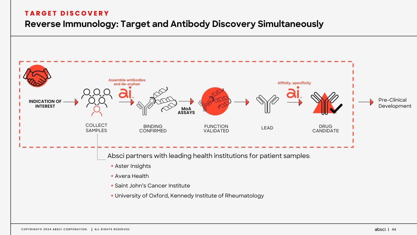 C O P Y R I G H T © 2 0 2 4 A B S C I C O R P O R A T I O N . A L L R I G H T S R E S E R V E D . 43 Target Discovery Reverse Immunology platform unifies target and antibody discovery in a single workflow enabling potential “first-in-class” biotherapeutics T A R G E T D I S C O V E R Y W I T H N O V E L A P P R O A C H E S Reverse Immunology for target discovery A I - G U I D E D L E A D O P T I M I Z A T I O N Multi-parameteric optimized antibodies A I - G U I D E D A N T I B O D Y D R U G C R E A T I O N De novo antibodies designed by AI