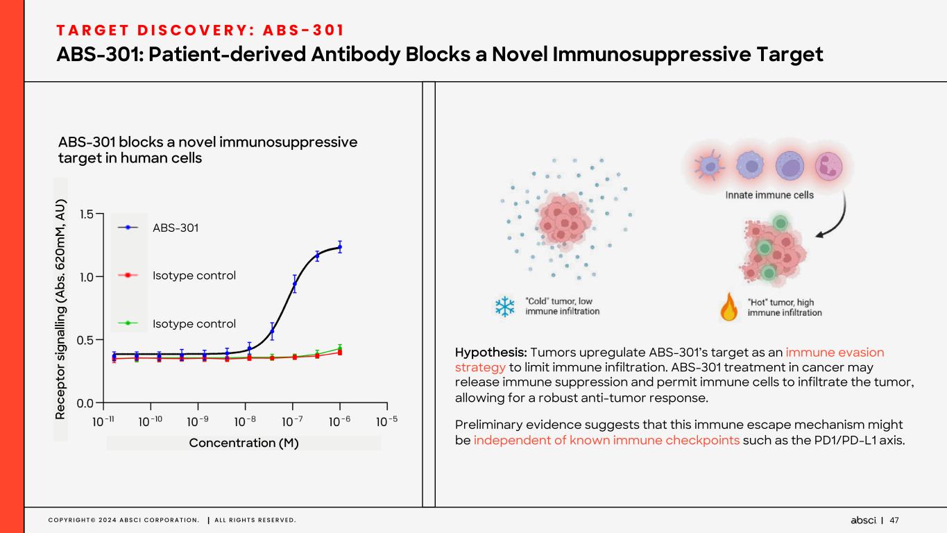 C O P Y R I G H T © 2 0 2 4 A B S C I C O R P O R A T I O N . A L L R I G H T S R E S E R V E D . 46 Computationally reconstructed antibodies from human TLS biopsies High-throughput proteomics screening technology covering the human proteome close to completeness A B S - 3 0 1 : R E C O N S T R U C T E D P A T I E N T - D E R I V E D A N T I B O D Y S H O W S H I G H L Y S P E C I F I C A N D P O T E N T B I N D I N G T O A N O V E L T A R G E T W I T H P O T E N T I A L I N I M M U N O - O N C O L O G Y . ABS-301 KD: 26.5nM Biolayer interferometry validates potent and specific binding against a novel, undisclosed target Identification of a Novel Immunomodulatory Antibody ABS-301 T A R G E T D I S C O V E R Y : A B S - 3 0 1