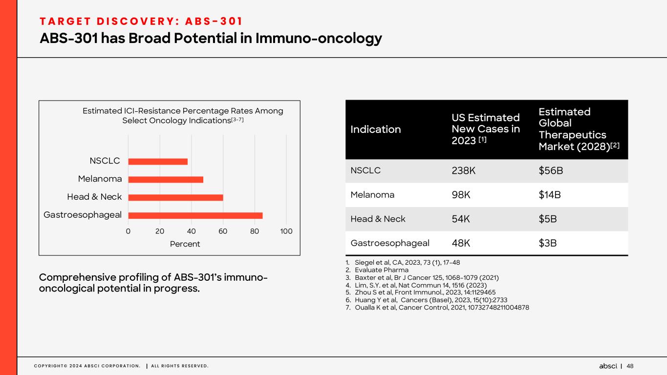 C O P Y R I G H T © 2 0 2 4 A B S C I C O R P O R A T I O N . A L L R I G H T S R E S E R V E D . 47 ABS-301 blocks a novel immunosuppressive target in human cells ABS-301: Patient-derived Antibody Blocks a Novel Immunosuppressive Target T A R G E T D I S C O V E R Y : A B S - 3 0 1 Hypothesis: Tumors upregulate ABS-301’s target as an immune evasion strategy to limit immune infiltration. ABS-301 treatment in cancer may release immune suppression and permit immune cells to infiltrate the tumor, allowing for a robust anti-tumor response. Preliminary evidence suggests that this immune escape mechanism might be independent of known immune checkpoints such as the PD1/PD-L1 axis. ABS-301 Isotype control Isotype control Re ce pt or s ig na llin g (A bs . 6 20 m M , A U ) Concentration (M)