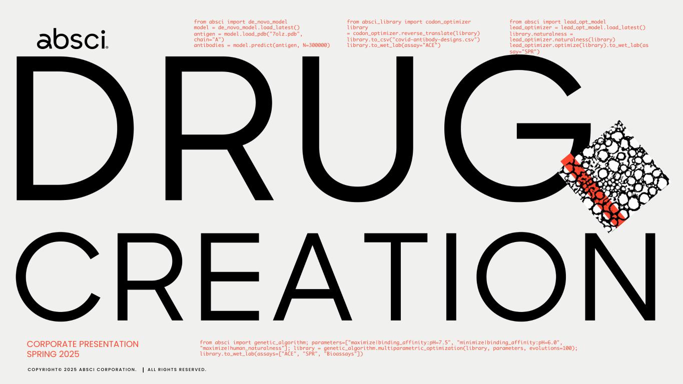 from absci import de_novo_model model = de_novo_model.load_latest() antigen = model.load_pdb("7olz.pdb", chain="A") antibodies = model.predict(antigen, N=300000) from absci_library import codon_optimizer library = codon_optimizer.reverse_translate(library) library.to_csv("covid-antibody-designs.csv") library.to_wet_lab(assay="ACE") from absci import lead_opt_model lead_optimizer = lead_opt_model.load_latest() library.naturalness = lead_optimizer.naturalness(library) lead_optimizer.optimize(library).to_wet_lab(as say="SPR") from absci import genetic_algorithm; parameters=["maximize|binding_affinity:pH=7.5", "minimize|binding_affinity:pH=6.0", "maximize|human_naturalness"]; library = genetic_algorithm.multiparametric_optimization(library, parameters, evolutions=100); library.to_wet_lab(assays=["ACE", "SPR", "Bioassays"]) C O P Y R I G H T © 2 0 2 5 A B S C I C O R P O R A T I O N . A L L R I G H T S R E S E R V E D . CORPORATE PRESENTATION SPRING 2025