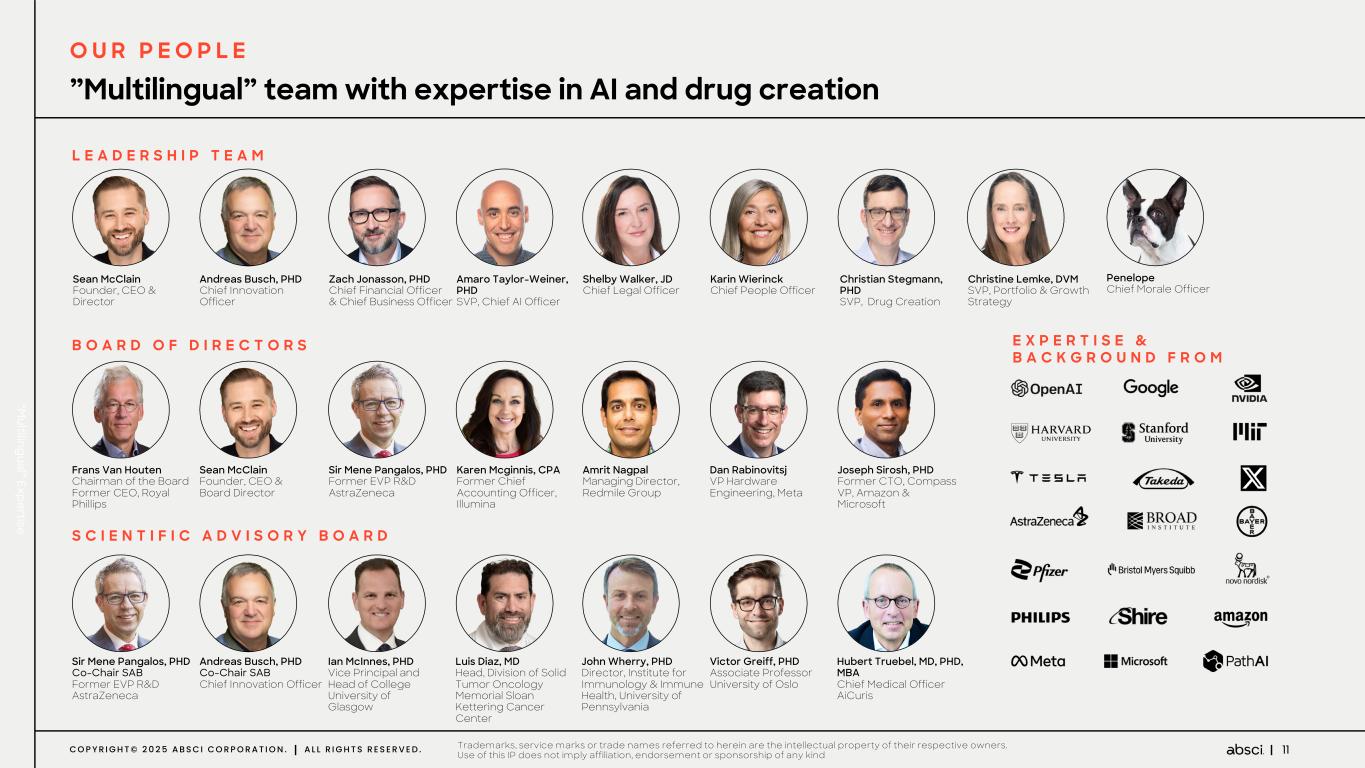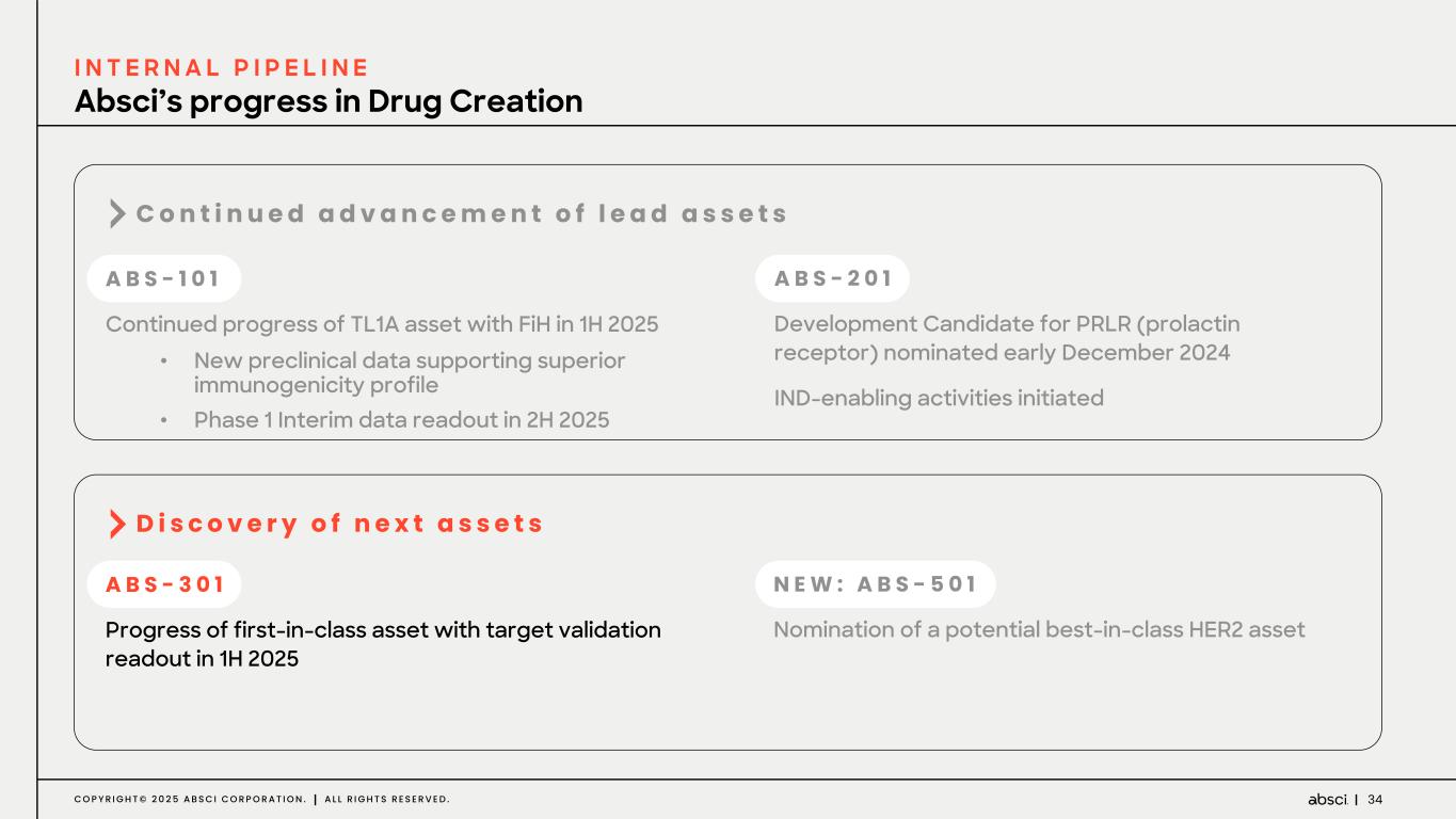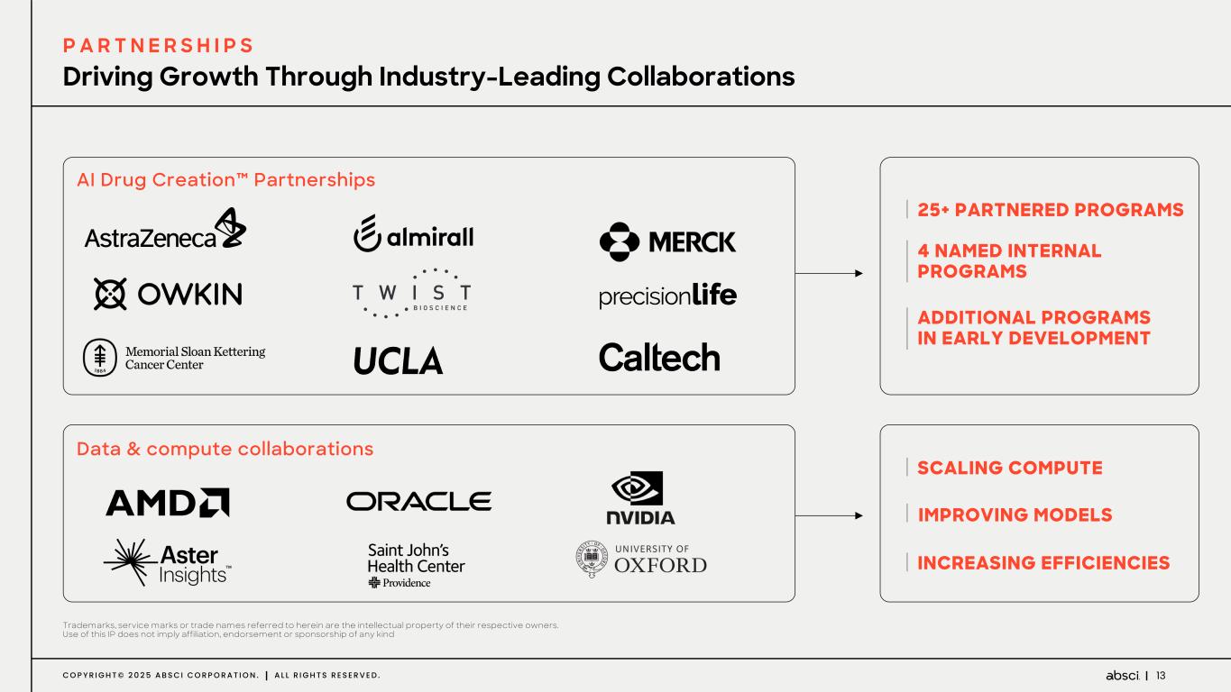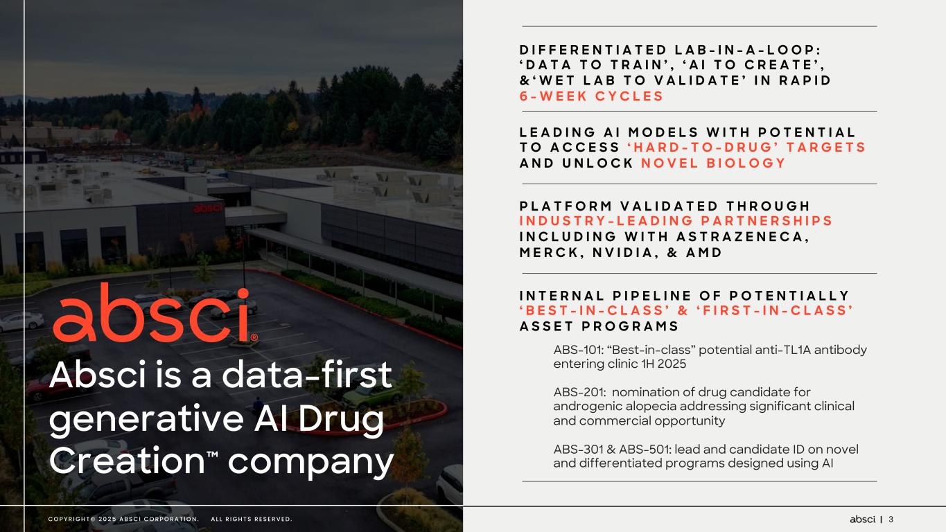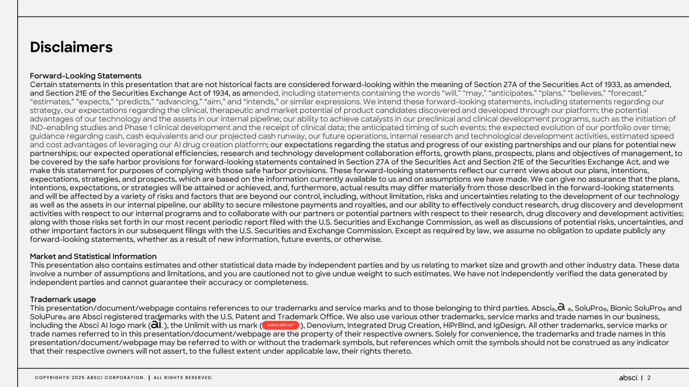 2C O P Y R I G H T © 2 0 2 5 A B S C I C O R P O R A T I O N . A L L R I G H T S R E S E R V E D . Disclaimers Forward-Looking Statements Certain statements in this presentation that are not historical facts are considered forward-looking within the meaning of Section 27A of the Securities Act of 1933, as amended, and Section 21E of the Securities Exchange Act of 1934, as amended, including statements containing the words “will,” “may,” “anticipates,” “plans,” “believes,” “forecast,” “estimates,” “expects,” “predicts,” “advancing,” “aim,” and “intends,” or similar expressions. We intend these forward-looking statements, including statements regarding our strategy, our expectations regarding the clinical, therapeutic and market potential of product candidates discovered and developed through our platform; the potential advantages of our technology and the assets in our internal pipeline; our ability to achieve catalysts in our preclinical and clinical development programs, such as the initiation of IND-enabling studies and Phase 1 clinical development and the receipt of clinical data; the anticipated timing of such events; the expected evolution of our portfolio over time; guidance regarding cash, cash equivalents and our projected cash runway, our future operations, internal research and technological development activities, estimated speed and cost advantages of leveraging our AI drug creation platform; our expectations regarding the status and progress of our existing partnerships and our plans for potential new partnerships; our expected operational efficiencies, research and technology development collaboration efforts, growth plans, prospects, plans and objectives of management, to be covered by the safe harbor provisions for forward-looking statements contained in Section 27A of the Securities Act and Section 21E of the Securities Exchange Act, and we make this statement for purposes of complying with those safe harbor provisions. These forward-looking statements reflect our current views about our plans, intentions, expectations, strategies, and prospects, which are based on the information currently available to us and on assumptions we have made. We can give no assurance that the plans, intentions, expectations, or strategies will be attained or achieved, and, furthermore, actual results may differ materially from those described in the forward-looking statements and will be affected by a variety of risks and factors that are beyond our control, including, without limitation, risks and uncertainties relating to the development of our technology as well as the assets in our internal pipeline, our ability to secure milestone payments and royalties, and our ability to effectively conduct research, drug discovery and development activities with respect to our internal programs and to collaborate with our partners or potential partners with respect to their research, drug discovery and development activities; along with those risks set forth in our most recent periodic report filed with the U.S. Securities and Exchange Commission, as well as discussions of potential risks, uncertainties, and other important factors in our subsequent filings with the U.S. Securities and Exchange Commission. Except as required by law, we assume no obligation to update publicly any forward-looking statements, whether as a result of new information, future events, or otherwise. Market and Statistical Information This presentation also contains estimates and other statistical data made by independent parties and by us relating to market size and growth and other industry data. These data involve a number of assumptions and limitations, and you are cautioned not to give undue weight to such estimates. We have not independently verified the data generated by independent parties and cannot guarantee their accuracy or completeness. Trademark usage This presentation/document/webpage contains references to our trademarks and service marks and to those belonging to third parties. Absci®, ®, SoluPro®, Bionic SoluPro® and SoluPure® are Absci registered trademarks with the U.S. Patent and Trademark Office. We also use various other trademarks, service marks and trade names in our business, including the Absci AI logo mark ( ), the Unlimit with us mark ( ), Denovium, Integrated Drug Creation, HiPrBind, and IgDesign. All other trademarks, service marks or trade names referred to in this presentation/document/webpage are the property of their respective owners. Solely for convenience, the trademarks and trade names in this presentation/document/webpage may be referred to with or without the trademark symbols, but references which omit the symbols should not be construed as any indicator that their respective owners will not assert, to the fullest extent under applicable law, their rights thereto.
