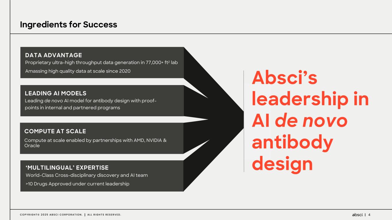 3C O P Y R I G H T © 2 0 2 5 A B S C I C O R P O R A T I O N . A L L R I G H T S R E S E R V E D . P L A T F O R M V A L I D A T E D T H R O U G H I N D U S T R Y - L E A D I N G P A R T N E R S H I P S I N C L U D I N G W I T H A S T R A Z E N E C A , M E R C K , N V I D I A , & A M D D I F F E R E N T I A T E D L A B - I N - A - L O O P : ‘ D A T A T O T R A I N ’ , ‘ A I T O C R E A T E ’ , & ‘ W E T L A B T O V A L I D A T E ’ I N R A P I D 6 - W E E K C Y C L E S I N T E R N A L P I P E L I N E O F P O T E N T I A L L Y ‘ B E S T - I N - C L A S S ’ & ‘ F I R S T - I N - C L A S S ’ A S S E T P R O G R A M S L E A D I N G A I M O D E L S W I T H P O T E N T I A L T O A C C E S S ‘ H A R D - T O - D R U G ’ T A R G E T S A N D U N L O C K N O V E L B I O L O G Y ABS-101: “Best-in-class” potential anti-TL1A antibody entering clinic 1H 2025 ABS-201: nomination of drug candidate for androgenic alopecia addressing significant clinical and commercial opportunity ABS-301 & ABS-501: lead and candidate ID on novel and differentiated programs designed using AI Absci is a data-first generative AI Drug Creation™ company