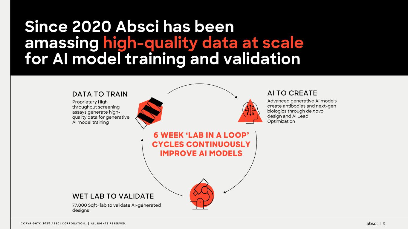 4C O P Y R I G H T © 2 0 2 5 A B S C I C O R P O R A T I O N . A L L R I G H T S R E S E R V E D . LEADING AI MODELS Leading de novo AI model for antibody design with proof- points in internal and partnered programs DATA ADVANTAGE Proprietary ultra-high throughput data generation in 77,000+ ft2 lab Amassing high quality data at scale since 2020 ‘MULTILINGUAL’ EXPERTISE World-Class Cross-disciplinary discovery and AI team >10 Drugs Approved under current leadership COMPUTE AT SCALE Compute at scale enabled by partnerships with AMD, NVIDIA & Oracle Ingredients for Success Absci’s leadership in AI de novo antibody design
