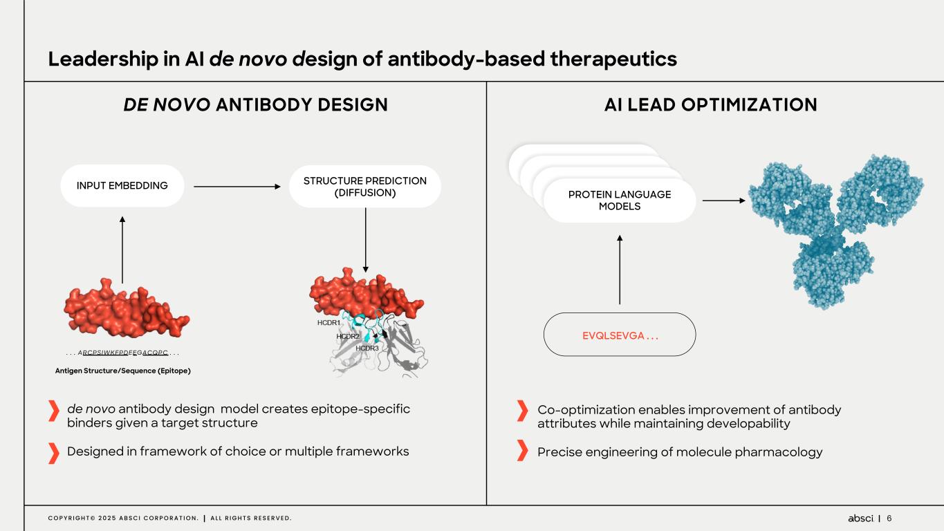 5C O P Y R I G H T © 2 0 2 5 A B S C I C O R P O R A T I O N . A L L R I G H T S R E S E R V E D . Since 2020 Absci has been amassing high-quality data at scale for AI model training and validation DATA TO TRAIN Proprietary High throughput screening assays generate high- quality data for generative AI model training WET LAB TO VALIDATE 77,000 Sqft+ lab to validate AI-generated designs AI TO CREATE Advanced generative AI models create antibodies and next-gen biologics through de novo design and AI Lead Optimization 6 WEEK ‘LAB IN A LOOP’ CYCLES CONTINUOUSLY IMPROVE AI MODELS