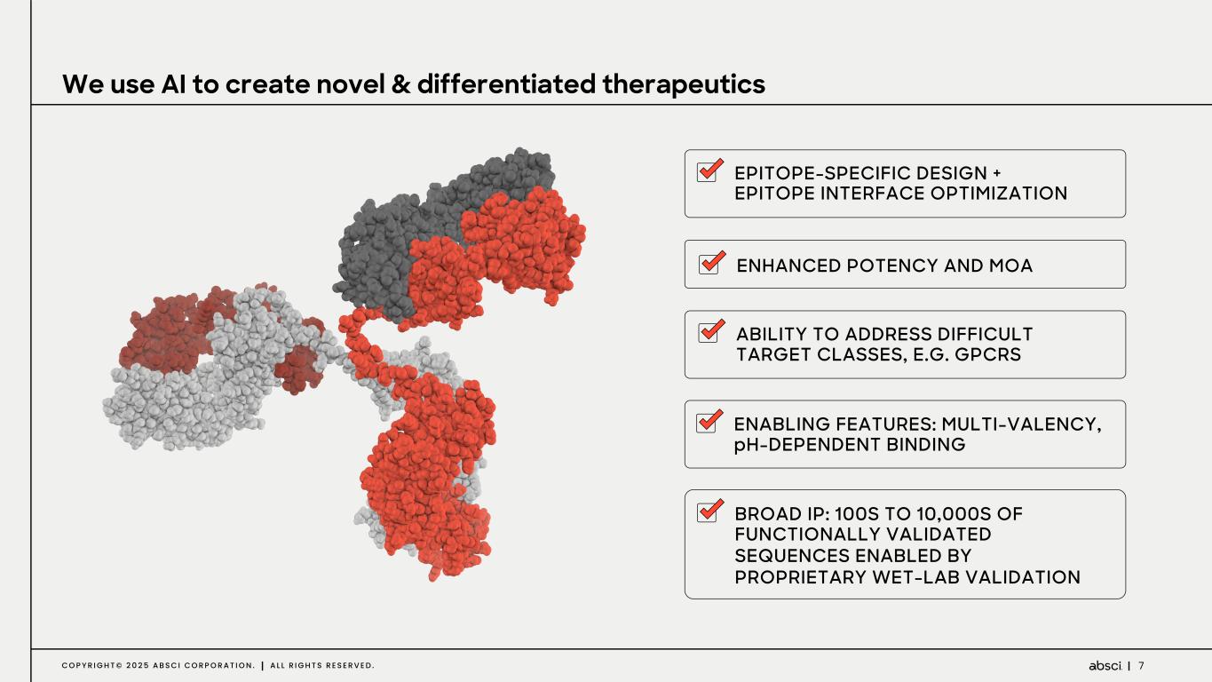 6C O P Y R I G H T © 2 0 2 5 A B S C I C O R P O R A T I O N . A L L R I G H T S R E S E R V E D . Leadership in AI de novo design of antibody-based therapeutics EVQLSEVGA . . . de novo antibody design model creates epitope-specific binders given a target structure Designed in framework of choice or multiple frameworks INPUT EMBEDDING STRUCTURE PREDICTION (DIFFUSION) . . . ARCPSIWKFPDEEGACQPC . . . Antigen Structure/Sequence (Epitope) PROTEIN LANGUAGE MODELS Co-optimization enables improvement of antibody attributes while maintaining developability Precise engineering of molecule pharmacology AI LEAD OPTIMIZATIONDE NOVO ANTIBODY DESIGN