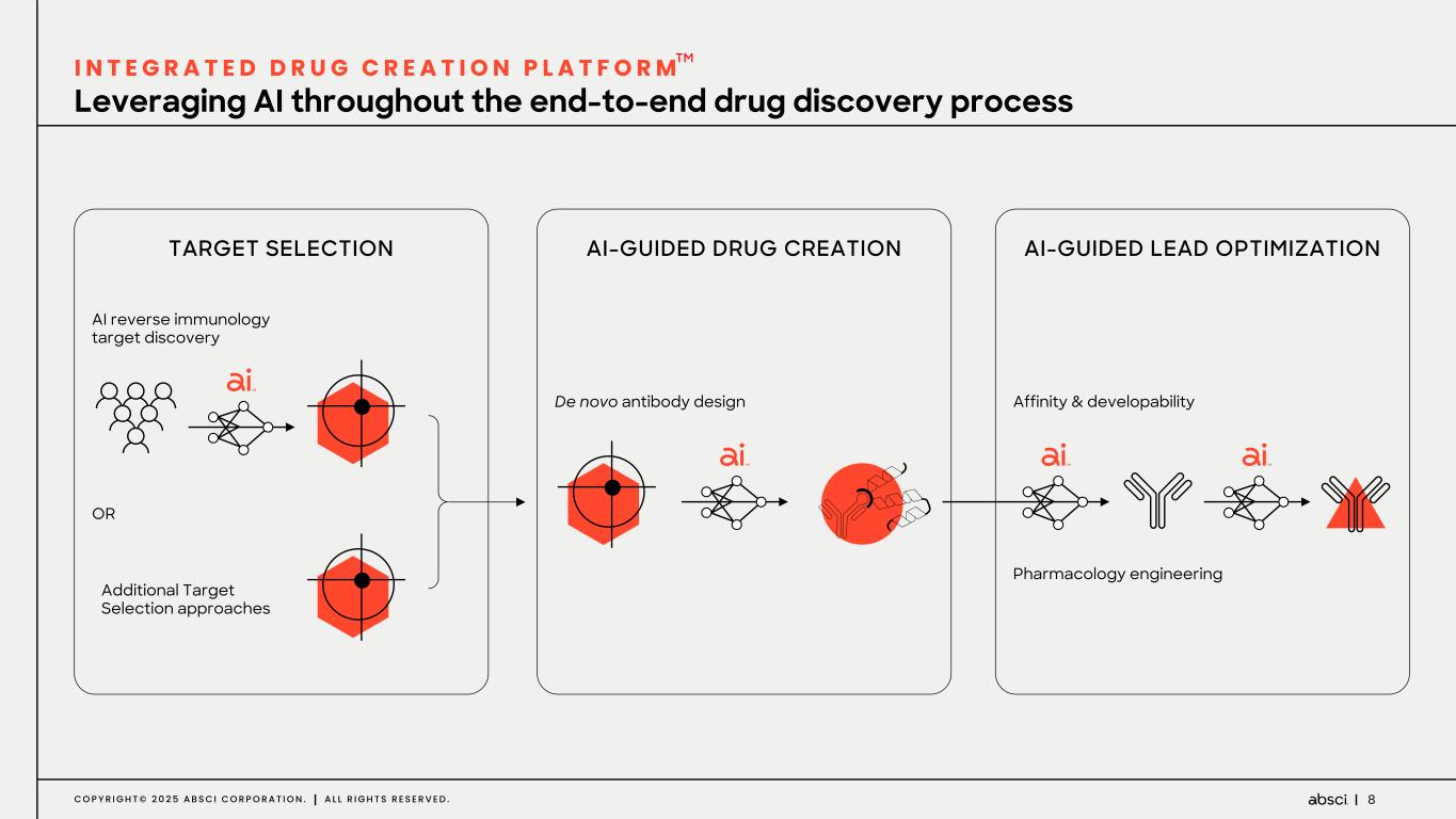 7C O P Y R I G H T © 2 0 2 5 A B S C I C O R P O R A T I O N . A L L R I G H T S R E S E R V E D . ENABLING FEATURES: MULTI-VALENCY, pH-DEPENDENT BINDING ABILITY TO ADDRESS DIFFICULT TARGET CLASSES, E.G. GPCRS EPITOPE-SPECIFIC DESIGN + EPITOPE INTERFACE OPTIMIZATION BROAD IP: 100S TO 10,000S OF FUNCTIONALLY VALIDATED SEQUENCES ENABLED BY PROPRIETARY WET-LAB VALIDATION ENHANCED POTENCY AND MOA We use AI to create novel & differentiated therapeutics
