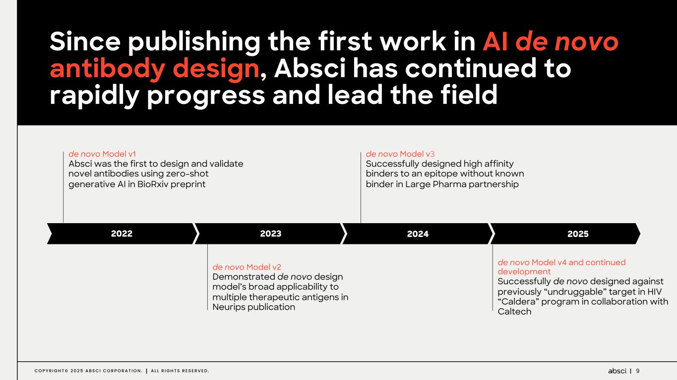 9C O P Y R I G H T © 2 0 2 5 A B S C I C O R P O R A T I O N . A L L R I G H T S R E S E R V E D . de novo Model v1 Absci was the first to design and validate novel antibodies using zero-shot generative AI in BioRxiv preprint de novo Model v2 Demonstrated de novo design model’s broad applicability to multiple therapeutic antigens in Neurips publication de novo Model v3 Successfully designed high affinity binders to an epitope without known binder in Large Pharma partnership de novo Model v4 and continued development Successfully de novo designed against previously “undruggable” target in HIV “Caldera” program in collaboration with Caltech 2022 2023 2024 2025 Since publishing the first work in AI de novo antibody design, Absci has continued to rapidly progress and lead the field