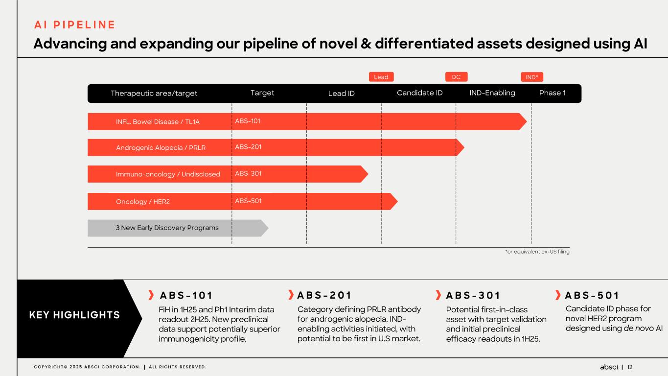 11C O P Y R I G H T © 2 0 2 5 A B S C I C O R P O R A T I O N . A L L R I G H T S R E S E R V E D . ”Multilingual” team with expertise in AI and drug creation Sean McClain Founder, CEO & Director Andreas Busch, PHD Chief Innovation Officer Zach Jonasson, PHD Chief Financial Officer & Chief Business Officer Amaro Taylor-Weiner, PHD SVP, Chief AI Officer Karin Wierinck Chief People Officer Christian Stegmann, PHD SVP, Drug Creation Christine Lemke, DVM SVP, Portfolio & Growth Strategy Shelby Walker, JD Chief Legal Officer Karen Mcginnis, CPA Former Chief Accounting Officer, Illumina Amrit Nagpal Managing Director, Redmile Group Joseph Sirosh, PHD Former CTO, Compass VP, Amazon & Microsoft Dan Rabinovitsj VP Hardware Engineering, Meta Frans Van Houten Chairman of the Board Former CEO, Royal Phillips Sir Mene Pangalos, PHD Former EVP R&D AstraZeneca Sean McClain Founder, CEO & Board Director Ian McInnes, PHD Vice Principal and Head of College University of Glasgow Hubert Truebel, MD, PHD, MBA Chief Medical Officer AiCuris Luis Diaz, MD Head, Division of Solid Tumor Oncology Memorial Sloan Kettering Cancer Center John Wherry, PHD Director, Institute for Immunology & Immune Health, University of Pennsylvania Victor Greiff, PHD Associate Professor University of Oslo Sir Mene Pangalos, PHD Co-Chair SAB Former EVP R&D AstraZeneca Andreas Busch, PHD Co-Chair SAB Chief Innovation Officer L E A D E R S H I P T E A M B O A R D O F D I R E C T O R S S C I E N T I F I C A D V I S O R Y B O A R D E X P E R T I S E & B A C K G R O U N D F R O M Penelope Chief Morale Officer O U R P E O P L E “M ultilingual” Expertise Trademarks, service marks or trade names referred to herein are the intellectual property of their respective owners. Use of this IP does not imply affiliation, endorsement or sponsorship of any kind
